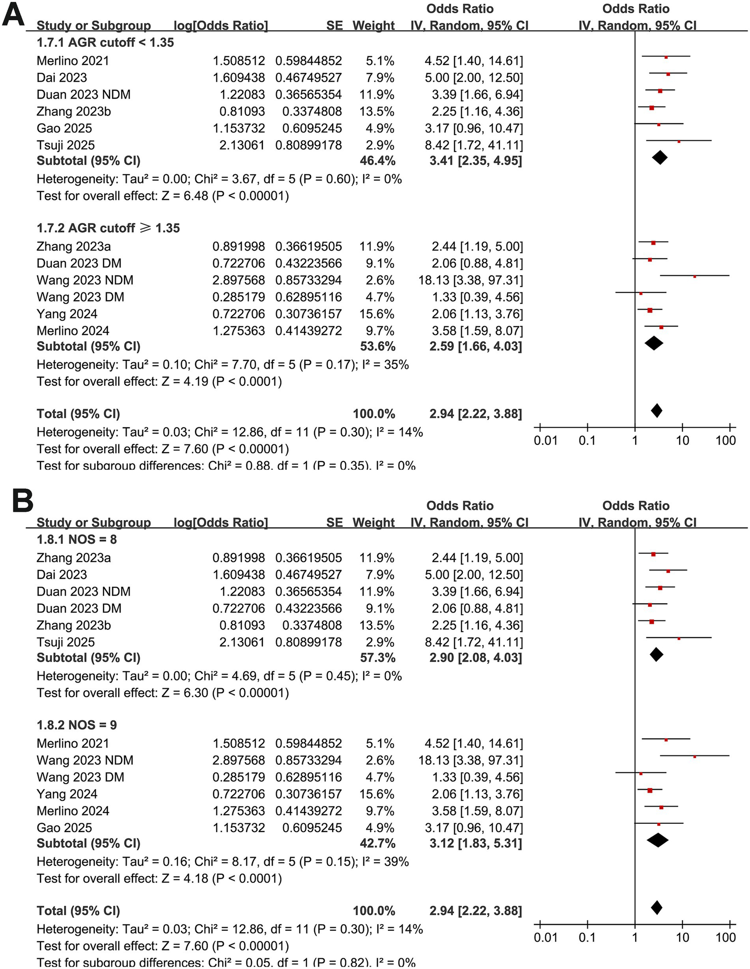 ![Forest plots comparing odds ratios. Panel A: Two subgroups based on AGR cutoff of less than 1.35 and at least 1.35. Studies show various log odds ratios, weights, and confidence intervals. The overall effect size for the subgroup with AGR less than 1.35 is 3.41 [2.35, 4.95], and for AGR at least 1.35, it is 2.59 [1.66, 4.03]. Panel B: Two subgroups based on NOS score of eight and nine. Studies show corresponding log odds ratios, weights, and confidence intervals. The overall effect size for NOS eight is 2.90 [2.08, 4.05], and for NOS nine, it is 3.12 [1.83, 5.31]. Both panels show total effect sizes around 2.94 [2.22, 3.88].](https://www.frontiersin.org/files/Articles/1692103/xml-images/fneur-16-1692103-g005.webp)