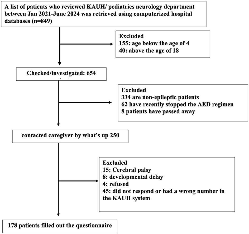 A total of 159 patients were removed due to age range (< 4 years to >18 years). Of the remaining 654 individuals on the list, 404 were removed because they were not epileptic (n = 334), had recently quit using AED (n = 62), or had died (n = 8). A total of 250 epileptic patients satisfied the study's inclusion criteria. Of these, 72 were eliminated for various reasons, leaving 178 patients to be recruited and included in the final analysis. Figure 1 presents detailed data.