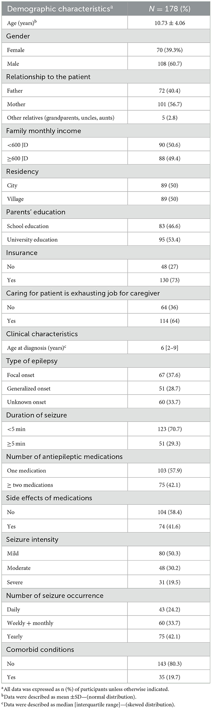 Patients had a mean age of 10.73 ± 4.06 years with more than half of the patients were males (60.7%) and insured (73%). Half of the patients' parents lived in the city (50%) and had a monthly income of < 600 JD (50.6%). More than half of them (64%) found caring for epileptic patients to be exhausting, and 46.6 % had only completed school education. The median age of diagnosis was 6 years. A third of the patients have a focal onset seizure (37.6%), most of the patients use only one medication (57.9%), and the majority do not have another chronic disease (80.3%). Around one quarter of patients had seizure episodes occurred on yearly basis (42.1%), with 50.3% having mild episodes, and the majority of patients' seizures lasted < 5 min (70.7%). Less than half of patients (41.6%) suffered from medication side effects. Detailed data is presented in Table 1.