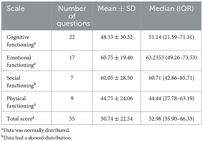 The shortened Quality of Life in Childhood Epilepsy Questionnaire (QOLCE-55) was developed and validated by Goodwin et al. (21). It is a parent-reported instrument specifically developed to assess the health-related quality of life (HRQoL) of children with epilepsy, aged 4–18 years (21). The Arabic version of this measure was validated by Khalil et al. (22) and was used in the current study. The questionnaire consists of four domains of life: cognitive (22 items), emotional (17 Items), social (seven items), and physical (nine items). In our study, the internal consistency of the questionnaire measured using Cronbach's alpha was 0.97. Responses are rated on a six-point Likert scale, ranging from 0 (very often) to 5 (not applicable). Each item's score was converted linearly into a 0–100 value, such as 0 = 0, 1 = 25, 2 = 50, 3 = 75, and 4 = 100. The scores were then summed up, and an average was determined, with higher scores reflecting better HRQoL.