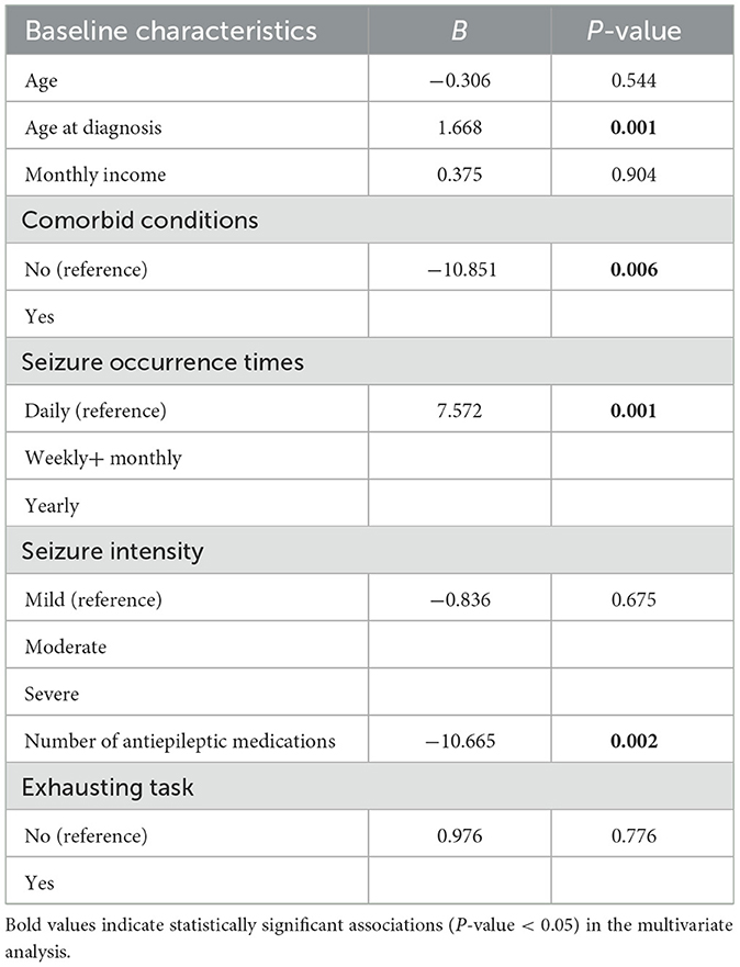 As presented in Table 2, the total QoL mean among patients was 50.74 ± 22.54 out of 100, with the greatest score was on the emotional scale at 60.75 ± 19.40 and the lowest was on the physical scale at 44.75 ± 24.06. Multivariate analysis (Table 3) revealed that older children at diagnosis (β = 1.668, P-value = 0.001), lack of comorbid conditions (β = −10.851, P-value 0.006), annual occurrence of seizure (β = 7.572, P-value = 0.001), and fewer number of epilepsy medications (β= −10.6651, P-value 0.002) were associated with better HRQoL and wellbeing.