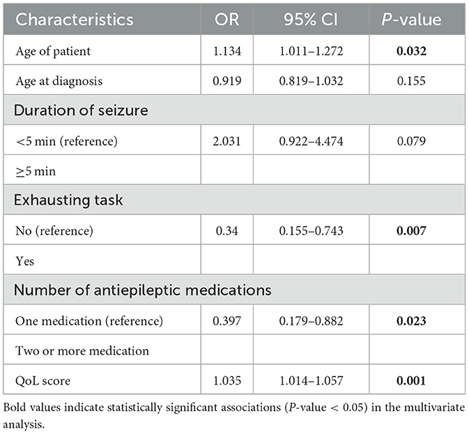 Less than half of patients (42.1%) were found to have controlled disease. As presented in Table 4, controlled epilepsy was found to be associated with older age (OR = 1.134, 95% CI = 1.011–1.272, P-value = 0.032) and having a higher quality of life (OR = 1.035, 95% CI = 1.014–1.057, P-value = 0.001). On the other hand, uncontrolled seizures were associated with parents who reported that caring for their children's seizures was an exhausting task (OR = 0.34, 95% CI = 0.155–0.743, P = 0.007), as well as with the need for higher number of antiepileptic drugs (OR = 0.397, 95% CI = 0.179–0.882, P = 0.023).