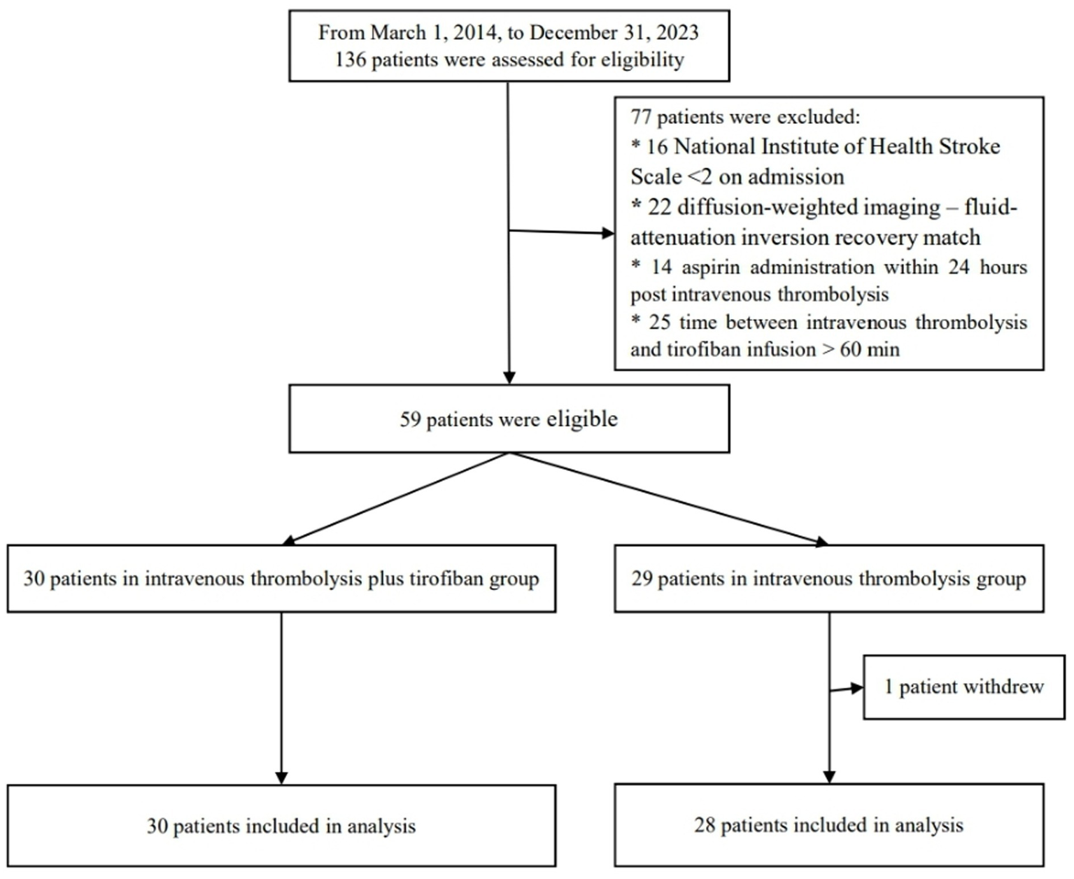 11. Liang, Z, Zhang, J, Huang, S, Yang, S, Xu, L, Xiang, W, et al. Safety and efficacy of low-dose rt-PA with tirofiban to treat acute non-cardiogenic stroke: a single-center randomized controlled study. BMC Neurol. (2022) 22:280. doi: 10.1186/s12883-022-02808-w
