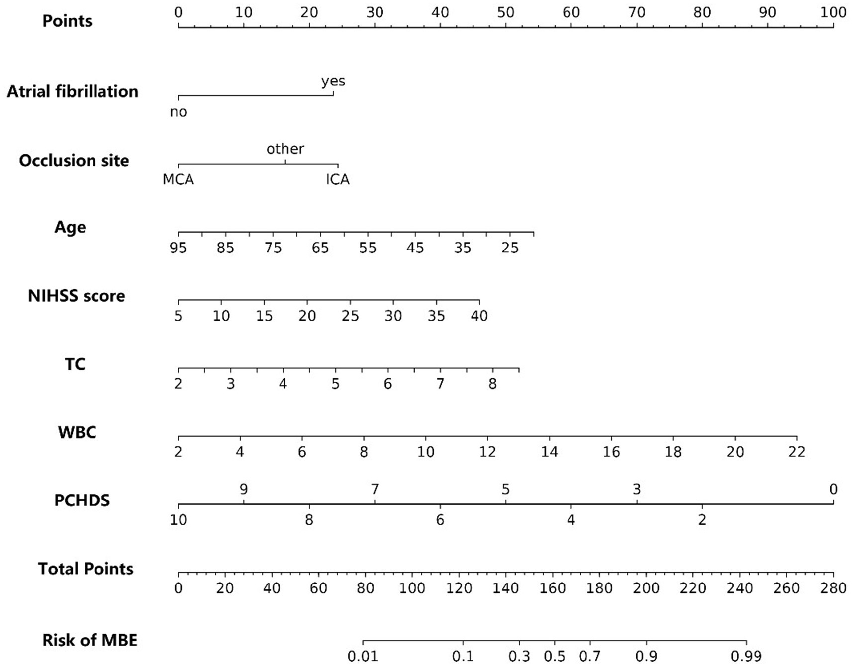 This study demonstrated that PCHDs were strongly associated with MBE in AIS patients with anterior circulation large vessel occlusion treated with MT. PCHDS ≤7 predicted the occurrence of MBE with a sensitivity of 86.4% and a specificity of 57.1%. The nomogram incorporating age, atrial fibrillation, baseline NIHSS score, occlusion site, white blood cell count, total cholesterol level, and PCHDS could reliably and individually predict the risk of MBE after MT. However, this model needed to be validated by a multicenter study.