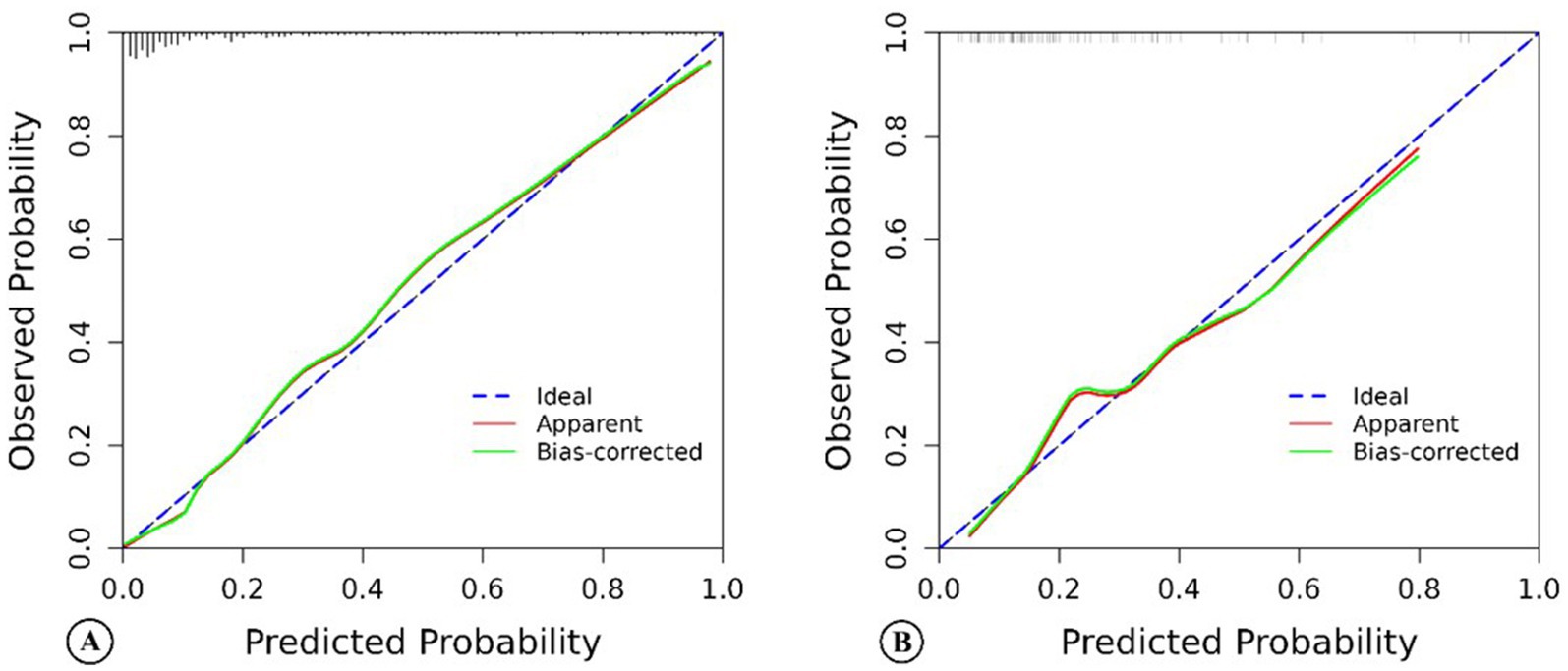 Figure 4. The calibration chart of the nomogram model predicting malignant brain edema of acute ischemic stroke patients in the training group (A) and the test group (B).