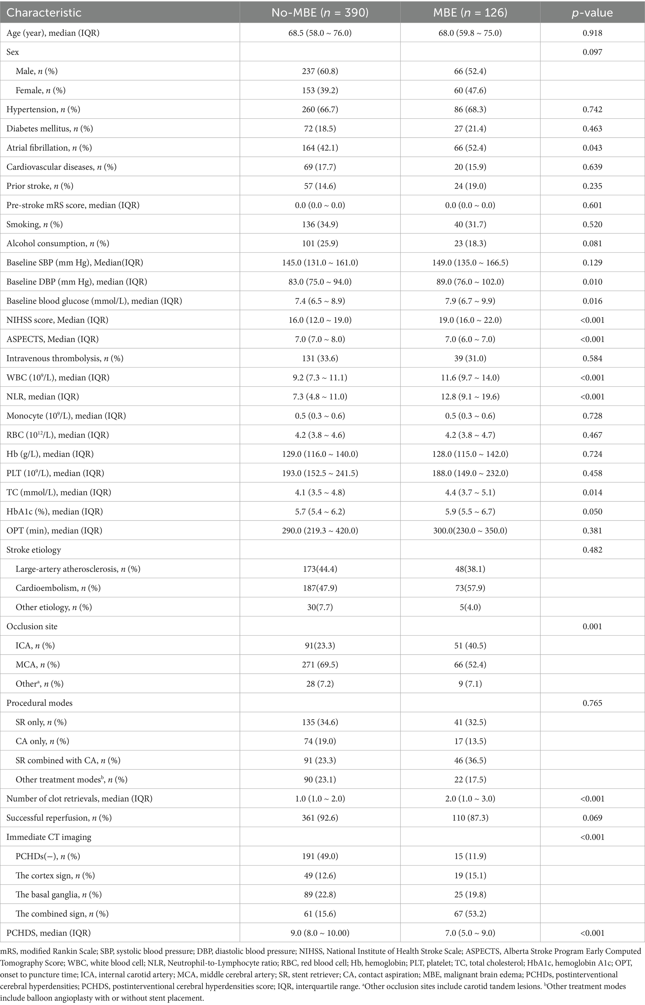 Table 1. Comparison of demographics and clinical characteristics between patients with and without MBE.