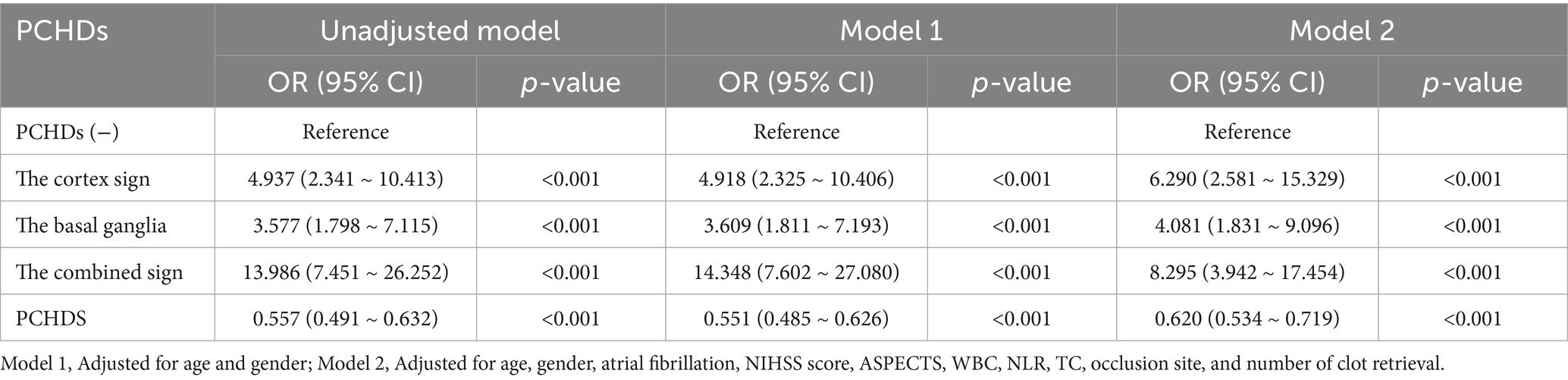 A logistic regression analysis was performed with postoperative MBE as the outcome variable, and the results are shown in Table 2. An unadjusted univariate analysis showed that the cortex–basal ganglia subtypes of PCHDs and PCHDS were correlated with MBE (p < 0.001). This association persisted after adjusting for age and sex in model 1 (p < 0.001). Furthermore, there were still statistical differences after the multivariate logistic regression analysis using stepwise regression screening variables (p < 0.001). After adjusting for age, sex, atrial fibrillation, baseline NIHSS score, ASPECTS, white blood cell count, NLR, total cholesterol level, occlusion site, and number of clot retrievals, the risk of MBE was 4.081 times higher in patients with the basal ganglia sign [adjusted odds ratio (OR) = 4.081, 95% confidence interval (CI): 1.831–9.096], 6.290 times higher in patients with the cortex sign (adjusted OR = 6.290, 95% CI: 2.581–15.329), and 8.295 times higher in patients with the combined sign (adjusted OR = 8.295, 95% CI: 3.942–17.454) than that in PCHDs(−) patients. When PCHDS increased by 1 point, the risk of MBE decreased by 38% (adjusted OR = 0.620, 95% CI: 0.534–0.719).