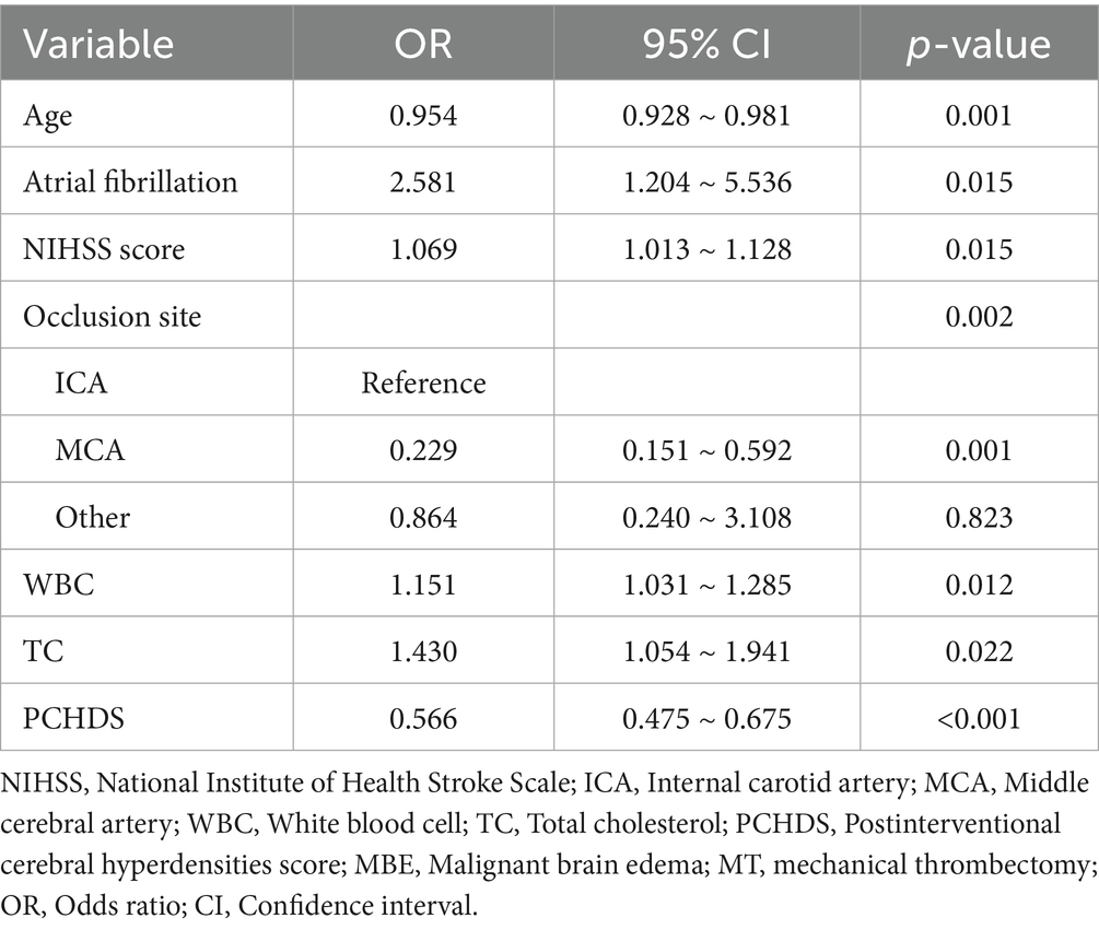 λmin was determined using LASSO regression and 10-fold cross validation, and 17 factors with non-zero coefficients were finally selected: age, atrial fibrillation, prior stroke, smoking history, intravenous thrombolysis, baseline blood glucose level, baseline NIHSS score, ASPECTS, white blood cell count, NLR, total cholesterol level, time from stroke onset to puncture (OPT), occlusion site, procedural modes, number of clot retrieval, successful reperfusion and PCHDS. The selected variables were included in the multivariate logistic regression analysis. After adjusting for prior stroke, smoking history, intravenous thrombolysis, baseline blood glucose level, ASPECTS, NLR, OPT, procedural modes, number of clot retrievals and successful reperfusion, the results showed that age (OR = 0.954, 95% CI: 0.928–0.981), atrial fibrillation (OR = 2.581, 95% CI: 1.204–5.536), baseline NIHSS score (OR = 1.069, 95% CI: 1.013–1.128), occlusion site (p < 0.01), white blood cell count (OR = 1.151, 95% CI: 1.031–1.285), total cholesterol level (OR = 1.430, 95% CI: 1.054–1.941), and PCHDS (OR = 0.566, 95% CI: 0.475–0.675) were independent risk factors for MBE (Table 3). Collinearity analysis suggested that there was no significant collinearity between the above variables (Supplementary Table S4).