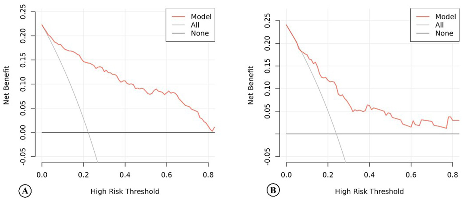 First, baseline information with and without MBE was described and compared among the patients included in this study. Second, the multivariate logistic regression analysis was performed to evaluate the predictive value of two PCHDs classification methods for MBE. The receiver operating characteristic (ROC) curve was used to analyze the optimal predictive value of the PCHDS for MBE. Finally, all patients were randomly divided into a training group and a test group at a ratio of 7:3. A nomogram was developed and internally validated in the training group, while external validation was conducted in the test group. Least absolute shrinkage and selection operator (LASSO) regression was applied to select significant predictors of MBE. Significant predictors were selected for the multivariate logistic regression analysis to construct the nomogram. If variance inflation factors (VIFs) were <5 and tolerances were >0.1, there was no significant collinearity between the variables. The performance of the nomogram was evaluated using the C-index, calibration chart, Hosmer–Lemeshow test, and decision curve analysis. Statistical analyses were conducted using IBM SPSS software version 26.0 and R 4.1.1 software, with a two-tailed p-value of < 0.05 considered statistically significant.