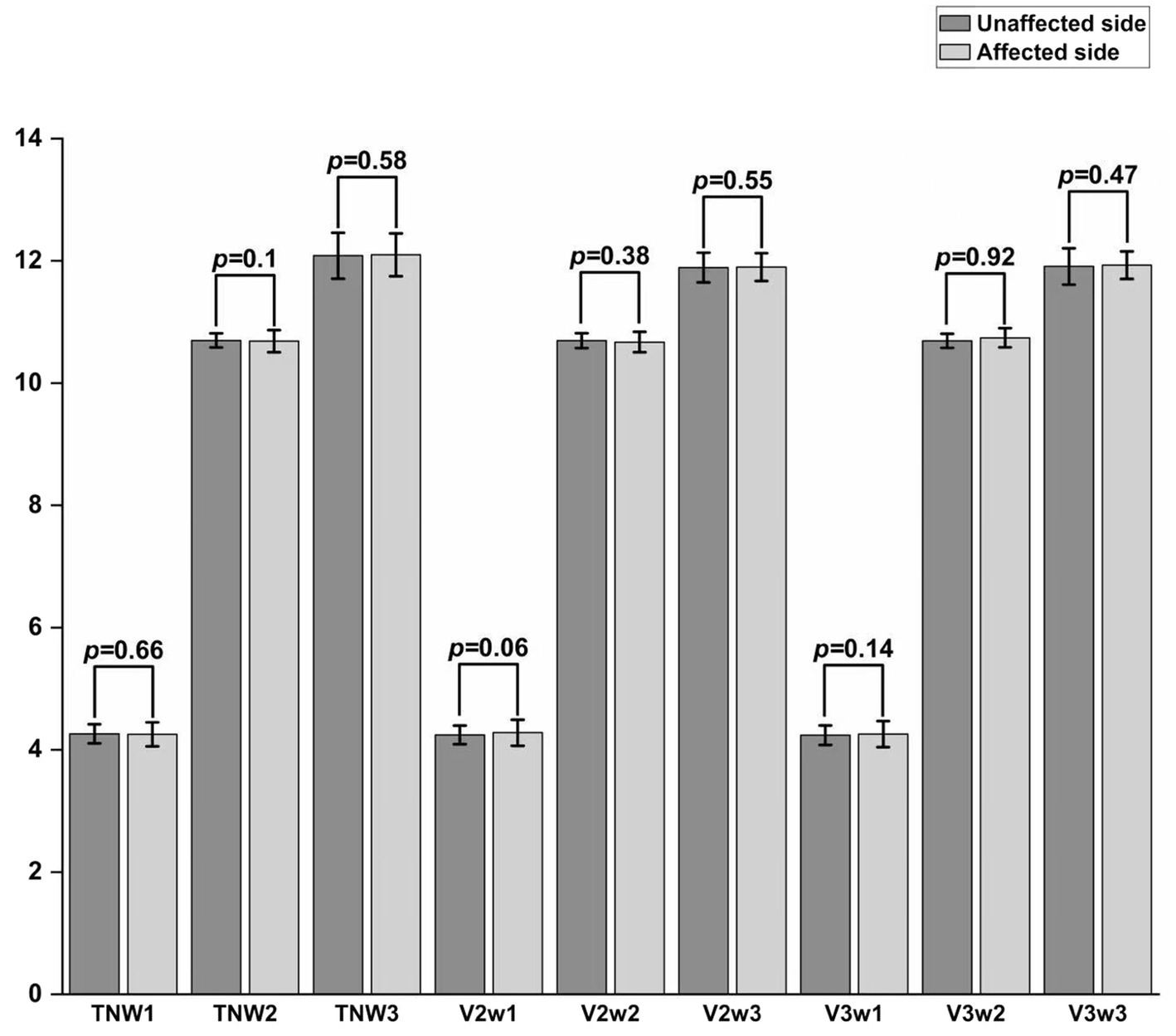 There were statistically significant differences in the W1, W2, and W3 amplitudes of the total TSEP, V2 branch, and V3 branch between the healthy side and the affected side in the study group (p < 0.05); however, there were no statistically significant differences in the W1 and W2 amplitudes of the V1 branch between the healthy and affected sides (p > 0.05), and in actual measurements, the W3 wave amplitude of V1 showed poor differentiation (Figure 4). There were no statistically significant differences in the latencies of W1, W2, and W3 of each branch in TSEP monitoring before and after MVD surgery (p > 0.05) (Figure 5).
