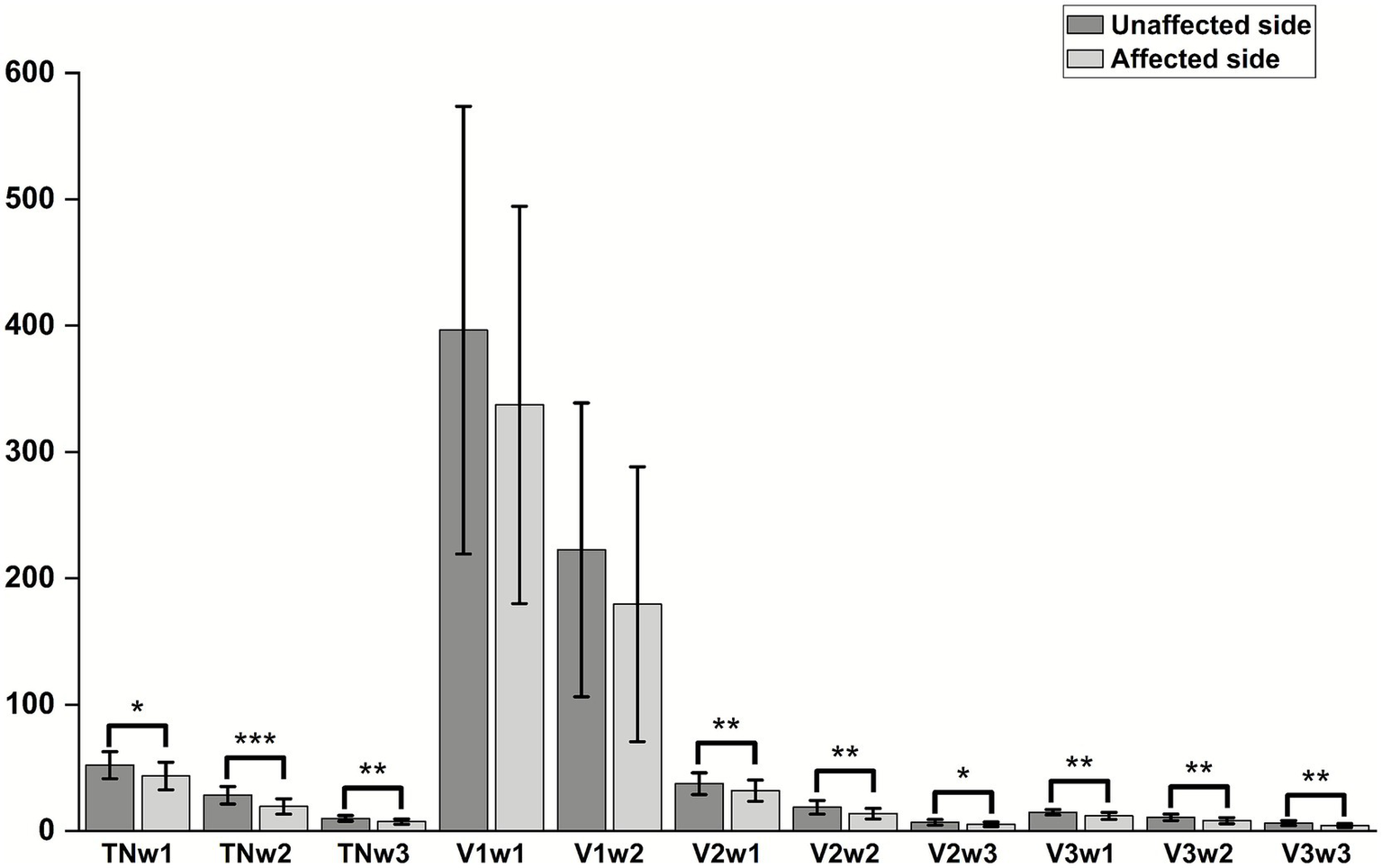 Comparison of TSEP amplitude between the unaffected and affected sides in patients with primary trigeminal neuralgia. *p < 0.05, **p < 0.01, ***p < 0.001; TN represents the trigeminal nerve; V1/V2/V3 represent the ophthalmic, maxillary, and mandibular branches of the trigeminal nerve, respectively.