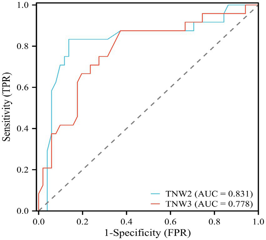 ROC curve analysis values of TNW2 and TNW3 waveform change rates and MVD surgical prognostic efficacy evaluation.