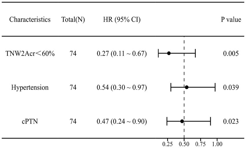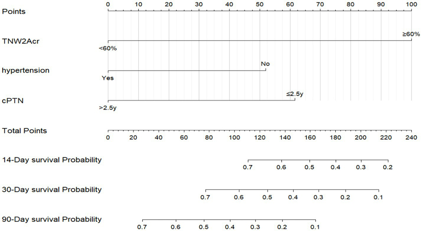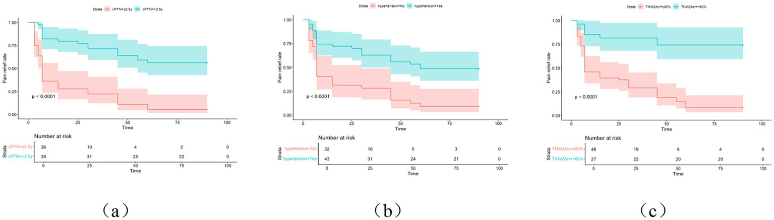 Cox regression analysis was used to examine the risk factors affecting the prognosis of MVD surgery in PTN patients. First, univariate Cox regression analysis was performed on all baseline variables, followed by stepwise variable selection in multivariate Cox regression. The significance levels for entry and retention were set at 0.1 to avoid excluding potentially important variables. For other statistical analyses, a two-sided p-value < 0.05 was considered statistically significant. After screening relevant factors based on multivariate logistic regression, a predictive model was constructed using a nomogram. The analysis was conducted using the ‘rms’ package in R Studio (R Foundation for Statistical Computing, Vienna, Austria). The predictive ability of the model was evaluated through calibration curves, and the stability of the predictive model was validated using the ROC curve. Finally, Kaplan–Meier survival analysis was performed to further verify the correlation of three factors—TNW2 amplitude change rate, hypertension, and PTN disease course—with MVD surgical prognosis.