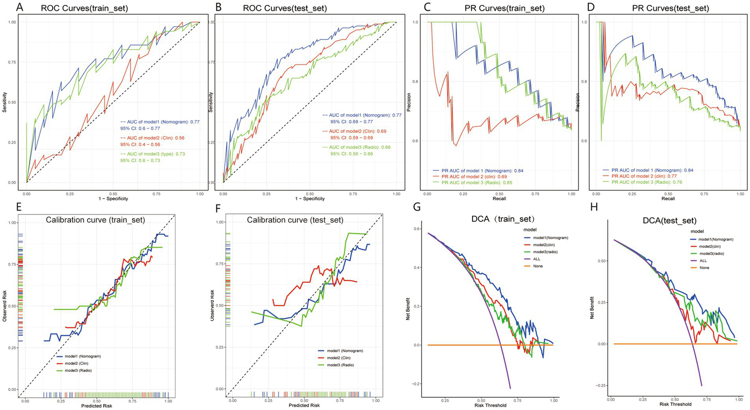 Univariate logistic regression was performed for each clinical variable, and those with p < 0.05 were subsequently included in the multivariate logistic regression model to identify independent risk factors for p53 overexpression in PitNETs. By integrating the identified clinical risk factors with the radiomics score, a nomogram model was constructed using R software (32). The predictive performance of the model was evaluated on the testing set. Key evaluation metrics included the area under the receiver operating characteristic curve (AUC), precision-recall (PR) curve, calibration curve, and decision curve analysis (DCA).