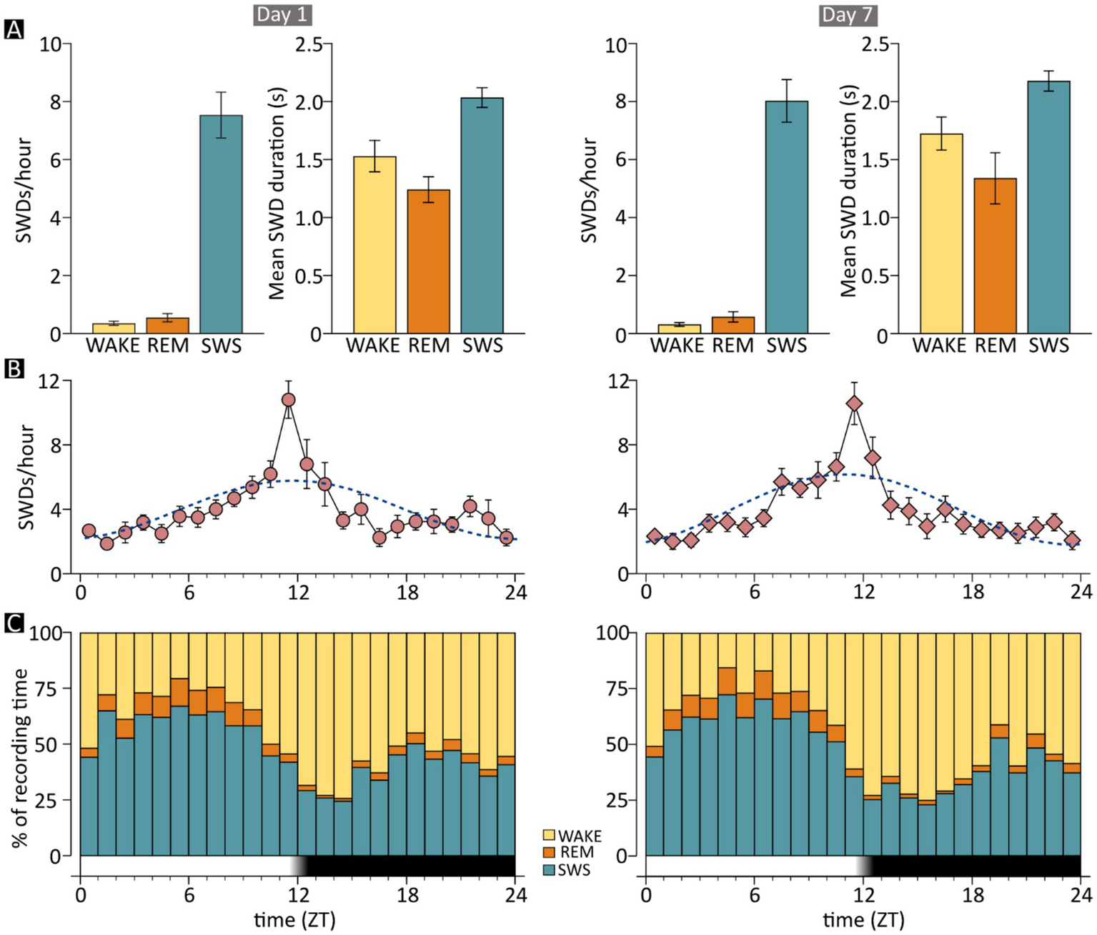 Occurrence of spike–wave discharges (SWDs) by time of day and vigilance state in JAX mice. Charts on the left- and right-hand side show results for recording days 1 and 7, respectively. (A) The mean frequency and duration of SWD episodes are shown separately for the three examined vigilance states. Frequencies are computed as the number of episodes per hour spent in each state. (B) The mean frequency of epileptic events is shown on an hourly basis, together with the cosinor function (dotted line). (C) The mean fraction of time spent in each vigilance state, for each hour of the recording day. The time axis in B and C shows the number of hours elapsed from “lights-on” time. The dark band indicates the “lights-off” hours. REM, REM sleep; SWS, slow-wave sleep; WAKE, wakefulness; ZT, Zeitgeber time; JAX, AJ mice from Jackson Laboratory.