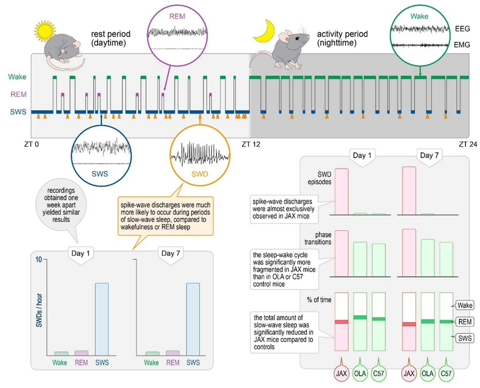 Here we report a highly consistent and specific pattern of spontaneous spike-and-wave discharges in all JAX mice studied so far, while abnormal events were extremely rare in control animals. The sleep–wake cycle was also altered in JAX mice, with reduced slow-wave sleep and poor sleep quality compared to the control groups.