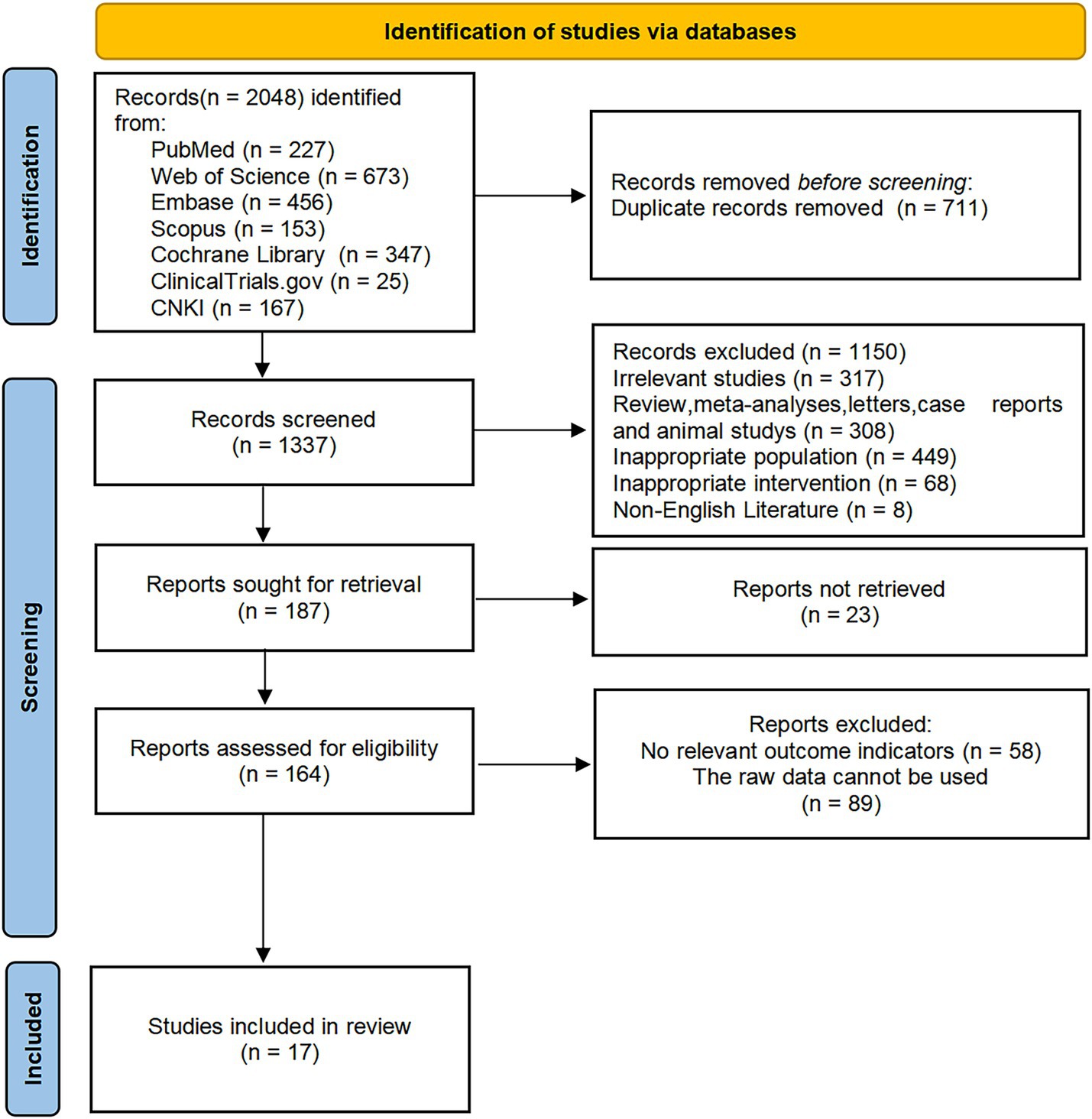 A total of 2,048 relevant articles were identified through database searches. After removing duplicates, 1,337 articles remained. Based on the inclusion and exclusion criteria, 187 articles were selected for full-text review. After screening the full texts, 170 articles were excluded. Ultimately, 17 studies met the eligibility criteria and were included in the final analysis (Figure 1).