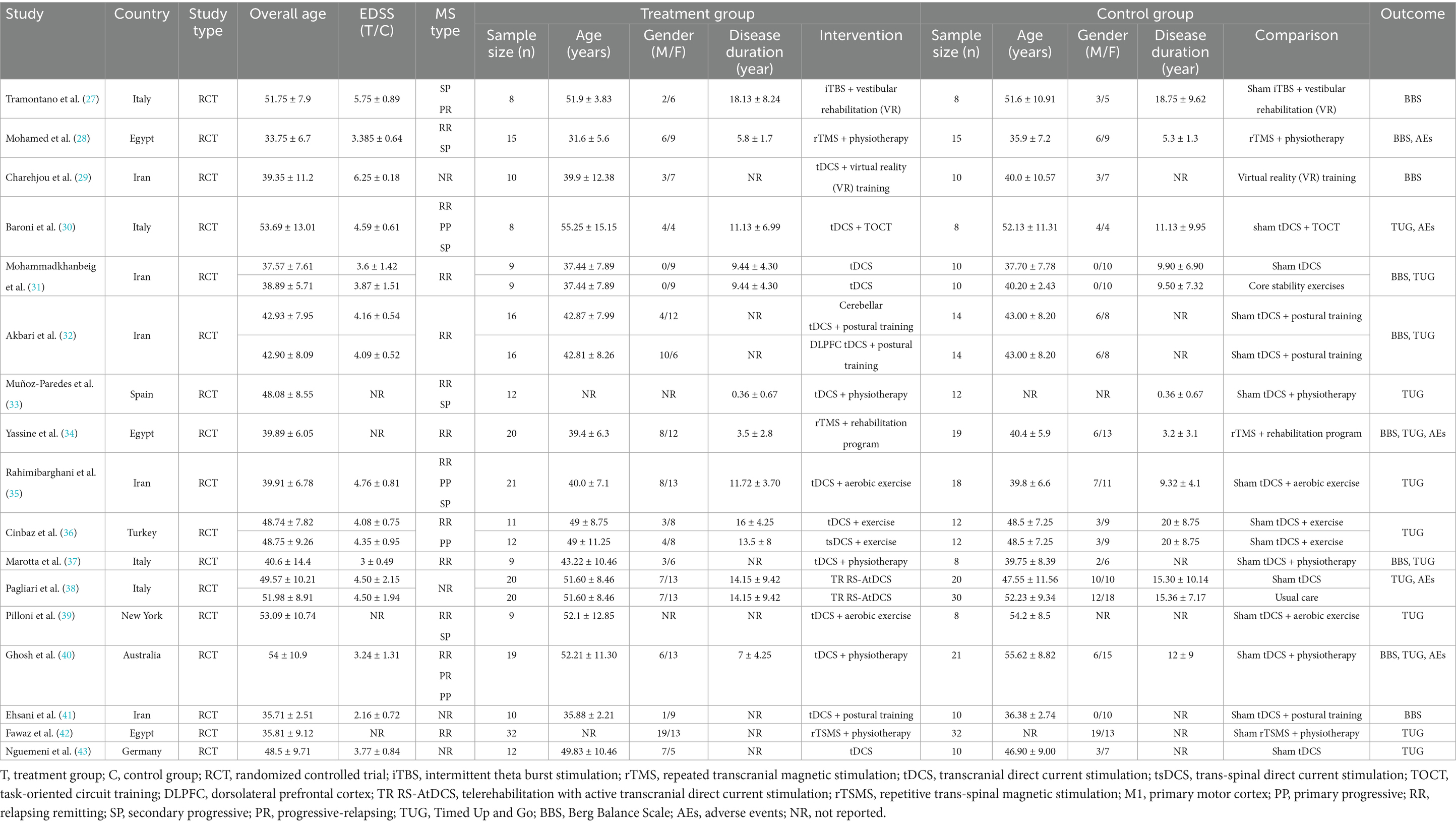 A total of 17 RCTs (27–43) involving 514 MS patients were included in this study. Among these, 269 patients were assigned to the treatment group, and 245 patients were in the control group. The sample sizes of individual studies ranged from 16 to 64 participants, with a mean age range of 35 to 55 years. The duration of the interventions varied from 1 week to 6 weeks. Thirteen studies used tDCS, two studies used rTMS, one study used repetitive transspinal magnetic stimulation (rTSMS), and one study used intermittent theta burst stimulation (iTBS). The interventions in the control group were rehabilitation training or sham stimulation. The detailed characteristics of the included studies are presented in Tables 1, 2.
