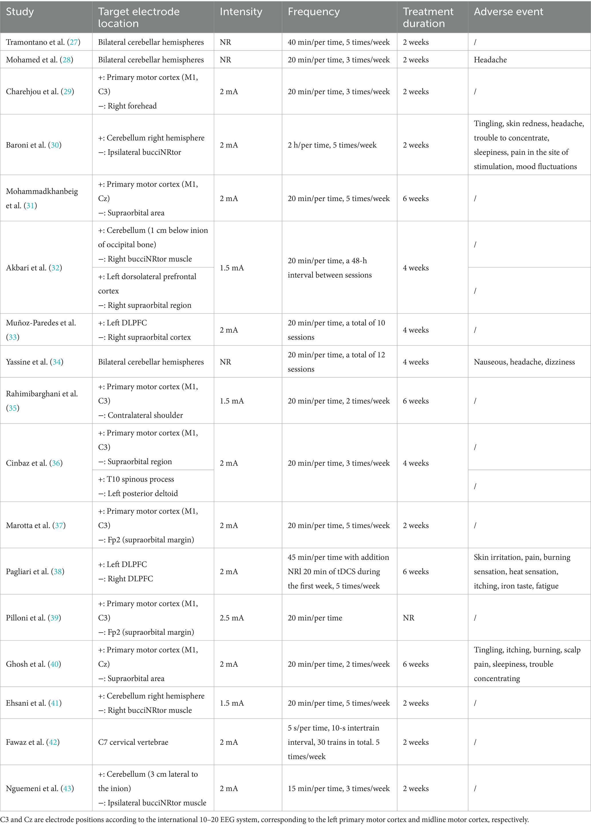 This study found that the incidence of adverse events was significantly higher in the NIBS intervention group compared to the control group. However, the vast majority of reported adverse events were mild and transient, such as skin tingling, itching at the stimulation site, mild headache, and a burning sensation. Serious adverse events were rarely observed. These discomforts may be related to factors such as locally elevated current density, the quality of the conductive medium, the method of current ramp-up/ramp-down, or individual differences in skin sensitivity (56, 57). Despite the increased risk of adverse events, their mild and temporary nature suggests that the overall safety profile of NIBS remains favorable.