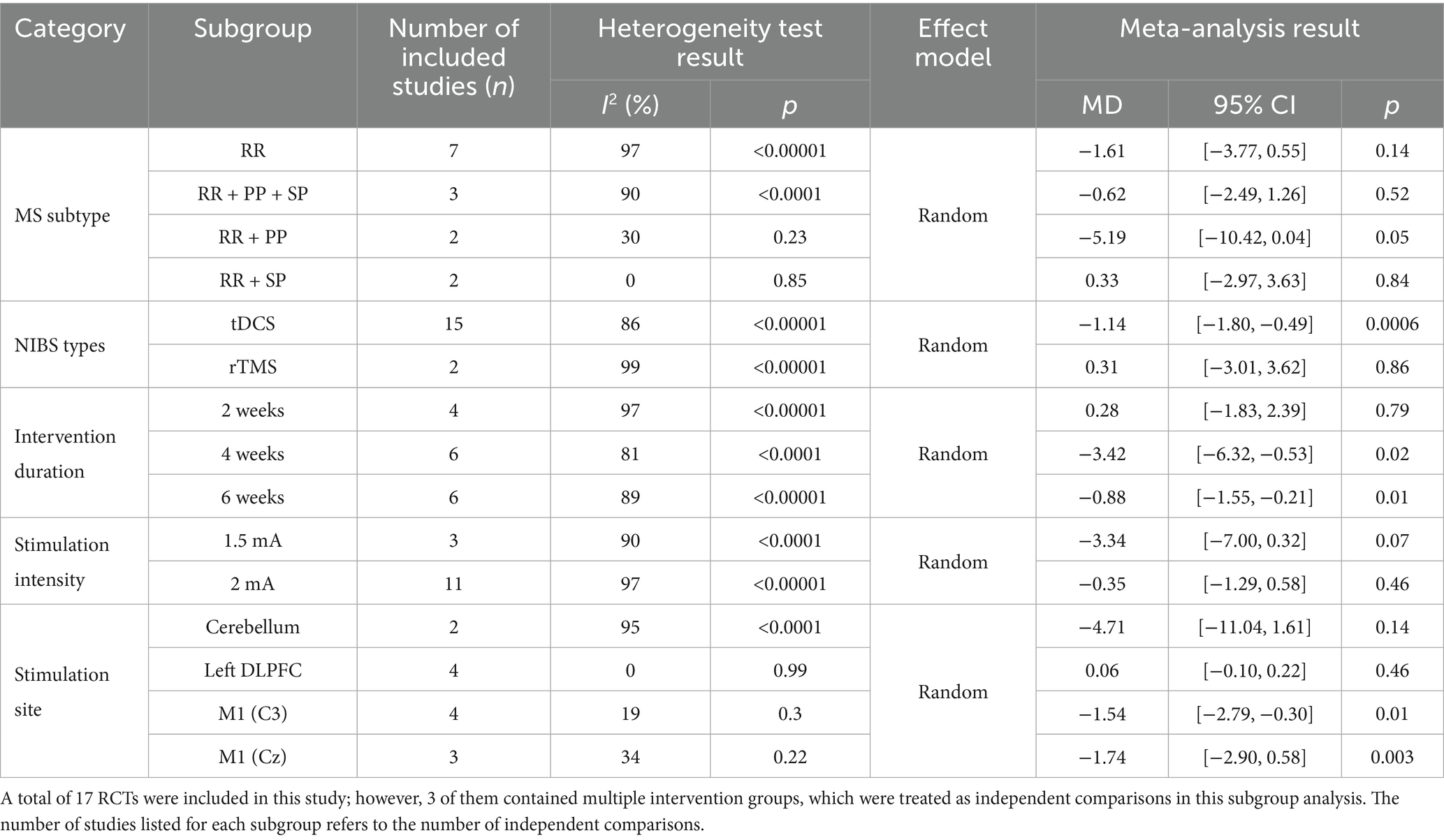 Subgroup analysis of BBS showed that both tDCS [MD = 3.57, 95% CI (0.84, 6.31)] and rTMS [MD = 4.08, 95% CI (0.18, 7.99)] were associated with improvements in BBS scores, suggesting that different types of NIBS may be effective in enhancing static balance function. Patients with RR MS demonstrated greater improvement [MD = 5.61, 95% CI (2.57, 8.65)], whereas those with RR + SP (secondary progressive) MS did not show significant benefits (p = 0.16). However, neither NIBS type nor MS subtype appeared to be significant sources of heterogeneity in BBS. No statistically significant differences were observed between subgroups based on intervention duration (p = 0.26, I2 = 26.5%), stimulation intensity (p = 0.21, I2 = 37.6%), or stimulation site (p = 0.79, I2 = 0%). Nevertheless, within-group analysis revealed that a 4-week intervention was particularly effective [MD = 7.57, 95% CI (0.99, 14.15)]. Stimulation targeting M1 (Cz) showed low heterogeneity (I2 = 15%), indicating that stimulation at other sites may be potential sources of inter-study heterogeneity. For further details, see Table 4 and Supplementary Figures S6–S10.
