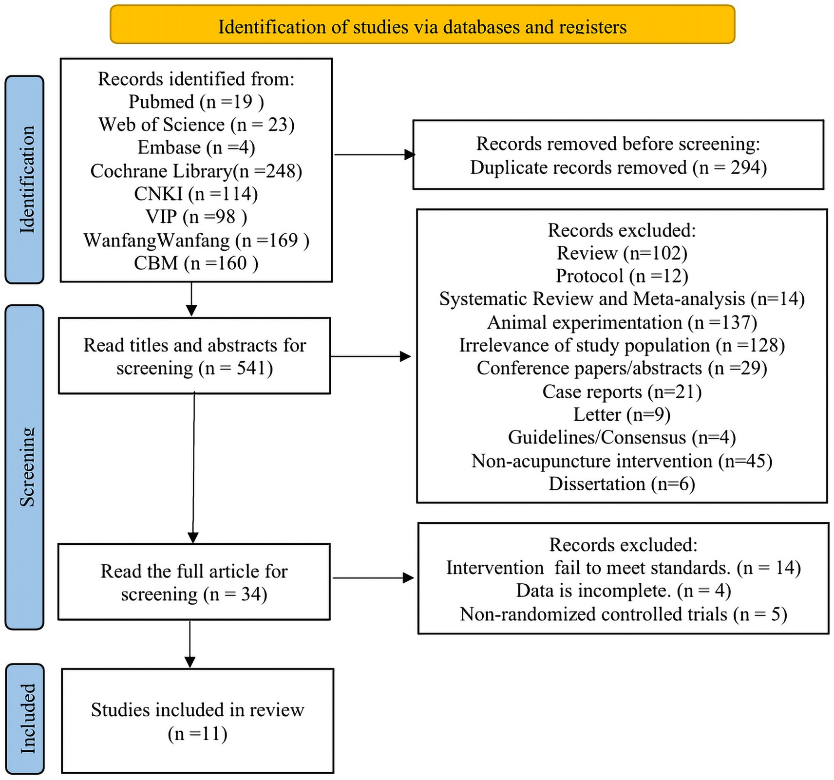 A total of 835 articles were retrieved, with 541 remaining after excluding duplicates. Following further screening based on titles and abstracts, 34 articles remained. After reviewing the full texts of these 34 articles, 11 ultimately met the inclusion criteria. The specific literature screening process is illustrated in Figure 1.