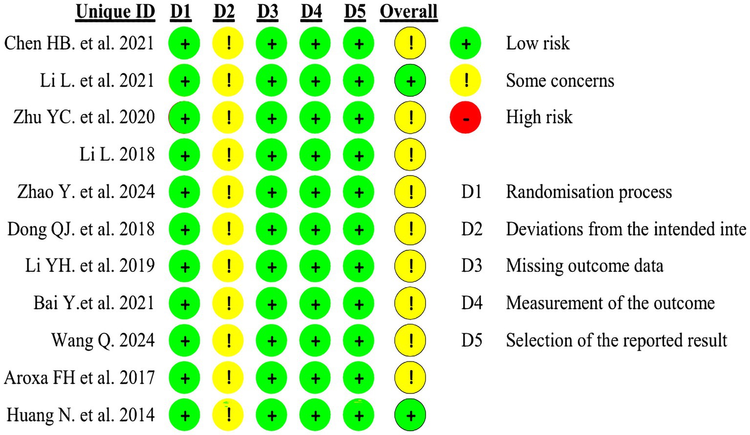 The included studies were assessed using the Cochrane Risk of Bias tool (ROB 2.0). Four studies employed random number tables for allocation, two studies randomized according to order of presentation, two studies used randomized drawing of lots, two studies merely mentioned random allocation, and one study utilized computer software for allocation. As all trial groups received acupuncture interventions, participant blinding could not be achieved in these studies, thereby compromising their overall quality. Detailed circumstances are presented in Figures 2, 3.