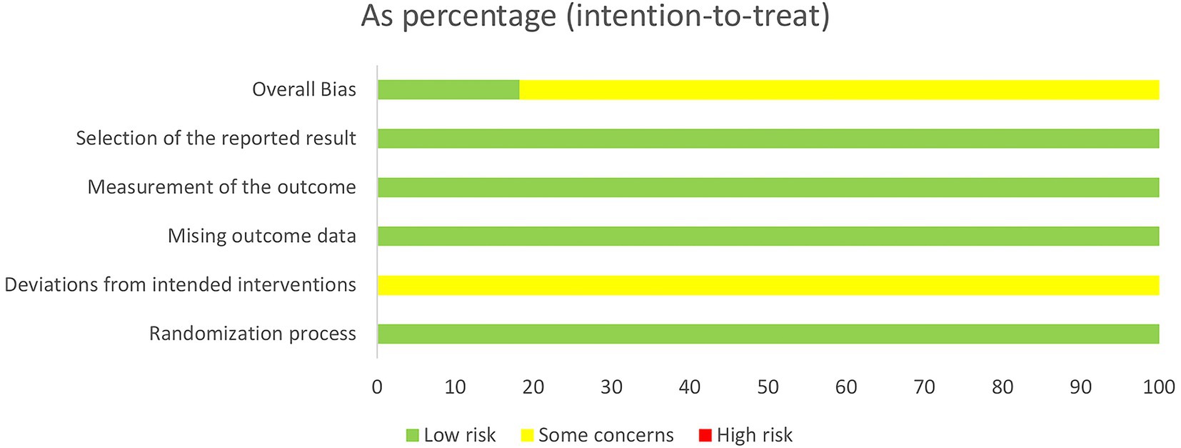 We employed the Cochrane Risk of Bias tool (ROB 2.0) to assess the quality of the included studies. This assessment tool comprises five domains: Bias in the randomization process, bias in deviation from the specified intervention, bias in missing outcome data, bias in outcome measurement, and bias in selective reporting of results. The bias in deviation from the specified intervention domain is further subdivided into two scenarios based on research objectives: one concerning the effect of intervention allocation, and the other concerning the effect of intervention adherence. Each domain contains multiple distinct signal questions. When assessing the risk of bias in RCTs, researchers must make judgments and objectively answer these questions. Signal questions typically offer five response options: Yes (Y), Probably Yes (PY), Probably No (PN), No (N), and No Information (NI).