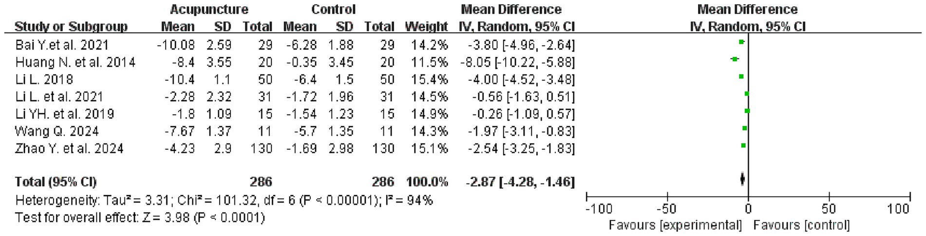 Seven studies evaluated PSQI scores before and after treatment, involving a total of 572 patients, with 286 patients in each of the treatment and control groups. The meta-analysis revealed that the intervention group demonstrated superiority over the control group in improving PSQI scores [mean difference (MD) = −2.87, 95% confidence interval (CI): −4.28 to −1.46; I2 = 94%, p < 0.0001] (see Figure 4 for details).