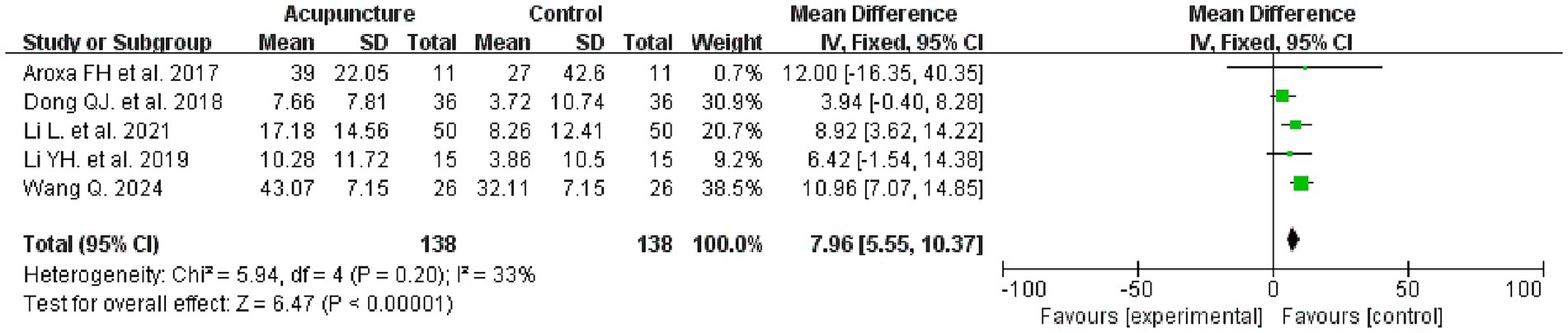 Forest plot showing mean differences between acupuncture and control groups across five studies. Each study displays mean, standard deviation, and confidence intervals. The overall effect size is 7.96 with a confidence interval of 5.55 to 10.37, indicating a significant effect. Heterogeneity is low with I-squared at thirty-three percent. The diagram includes a plot with squares representing individual study weights and a diamond symbol for the overall effect.