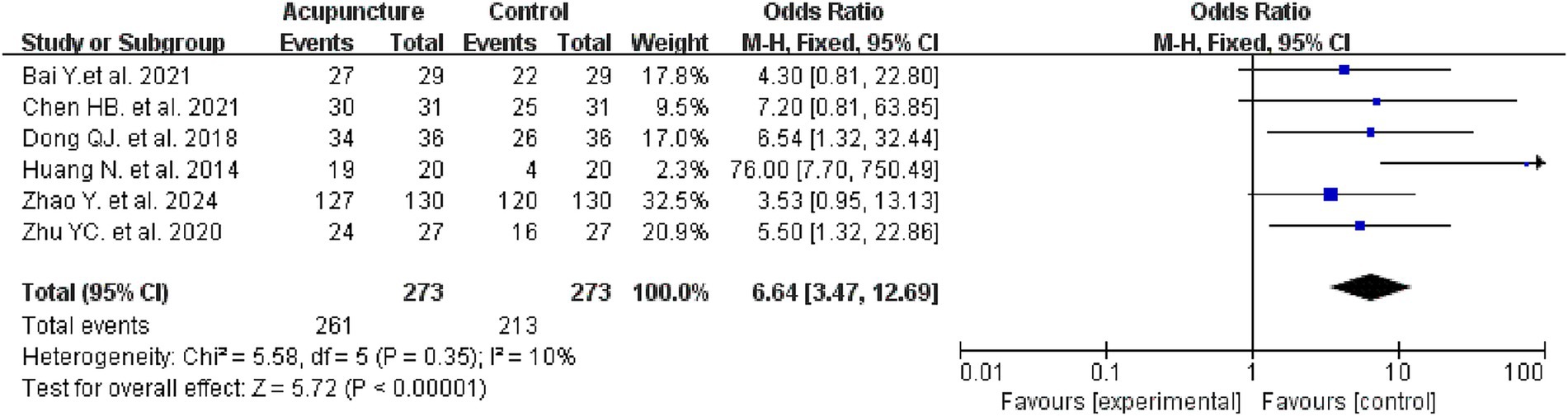 Six studies evaluated the efficacy rates in two groups, involving 556 patients, with 273 in the intervention group and 273 in the control group. Meta-analysis results indicated that the intervention group demonstrated a higher efficacy rate compared to the control group (OR = 6.64, 95% CI: 3.47–12.69, I2 = 10%, p < 0.00001) (see Figure 6 for details).