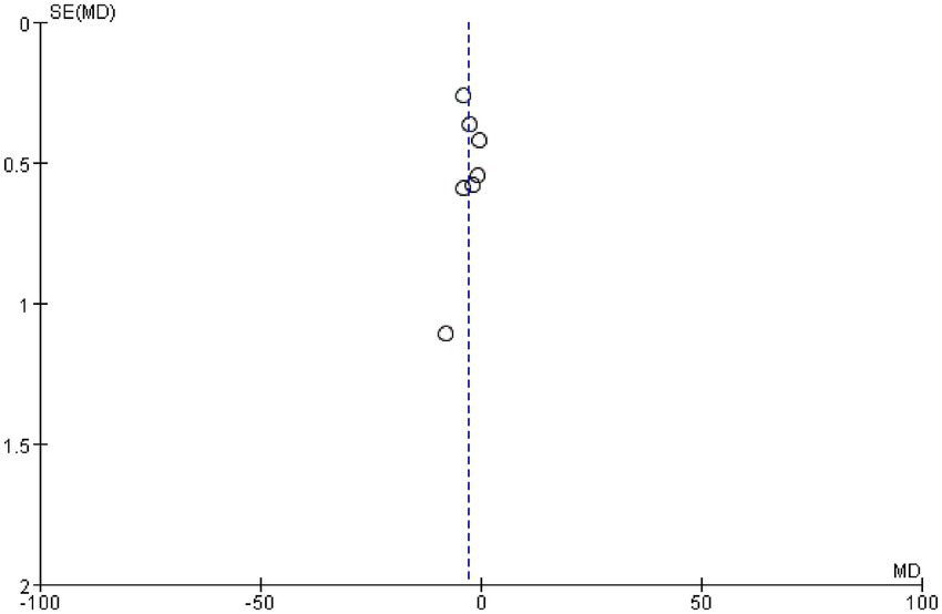 We examined whether publication bias existed in this study by plotting a funnel plot; a symmetrical funnel plot indicates no publication bias. Figure 7 presents the funnel plot for the PSQI, revealing no evidence of publication bias in the included studies.