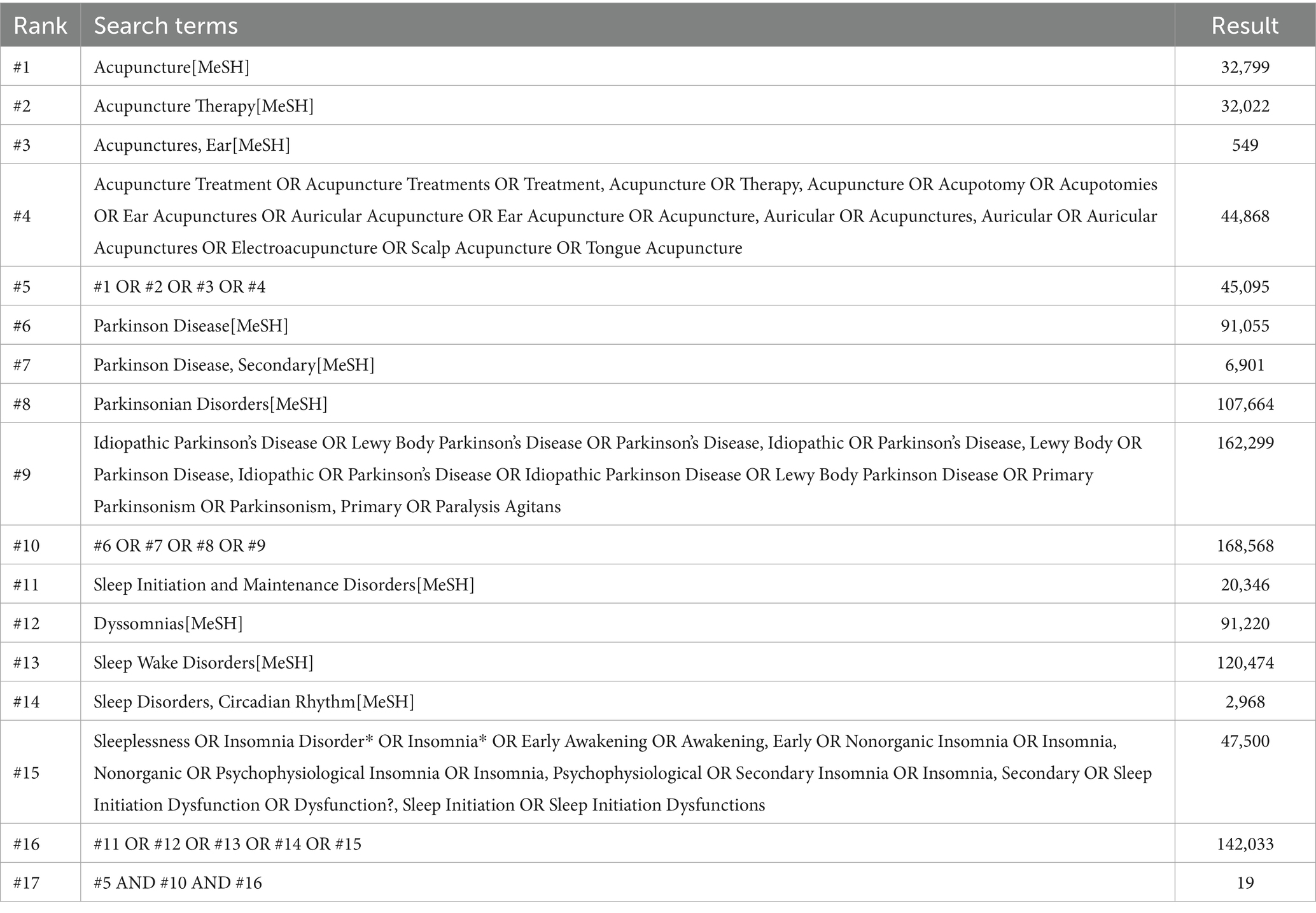 This study searched eight electronic databases including PubMed, Cochrane Library, Embase, Web of Science, China Knowledge Infrastructure (CNKI), China Science Journal Database (VIP), Wanfang Database, and China Biomedical Literature Service System (CBM). In addition, we also manually searched the clinical registration platforms ClinicalTrials.gov and the Chinese ClinicalTrial Registry, as well as the reference lists of included studies and the references of relevant systematic reviews. Publications were restricted to English and Chinese language materials, with the search conducted up to 26 July 2025. A combination of MeSH terms and free-text keywords was employed, with primary search terms including “Parkinson Disease”, “Insomnia,” and “Acupuncture”. The specific search strategy is detailed in Table 1 (using PubMed as an example).