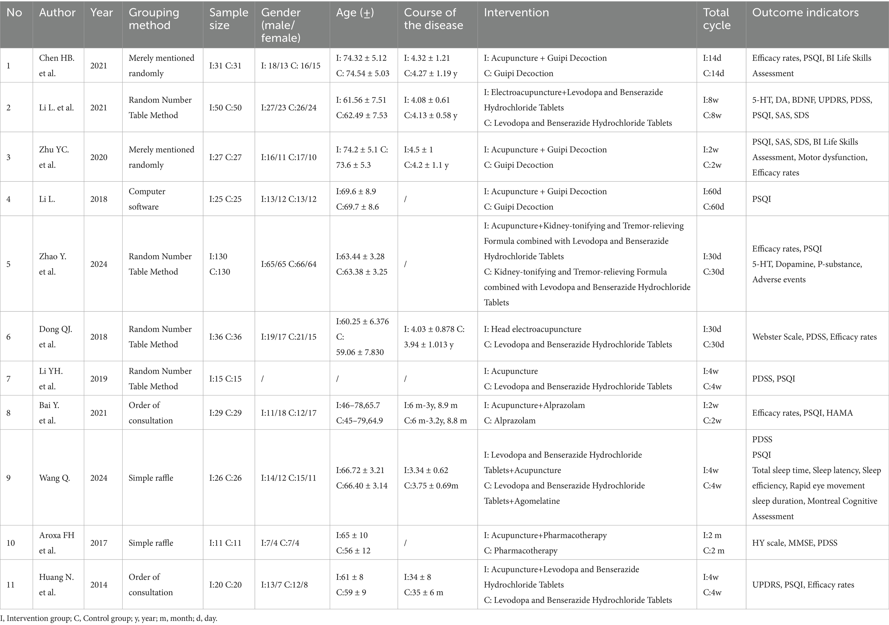 A total of 11 studies were included (18, 2029), with their basic characteristics summarized in Table 2. The 11 studies enrolled 800 patients, comprising 426 males (53.25%) and 374 females (46.75%). Ten studies were conducted in China, and one in Brazil. All studies provided specific diagnostic criteria, with 10 employing Chinese standards and one using British standards. Within the intervention groups, nine studies utilized body acupuncture, one employed electroacupuncture, and one used scalp electroacupuncture. In the control groups, three studies used Guipi Decoction as the control, four studies used Madopar, one study used Alprazolam, two studies used a combination of two medications, and one study did not specify the control medication. The intervention periods in the 11 studies ranged from 14 days to 8 weeks. Detailed information is presented in Table 2.