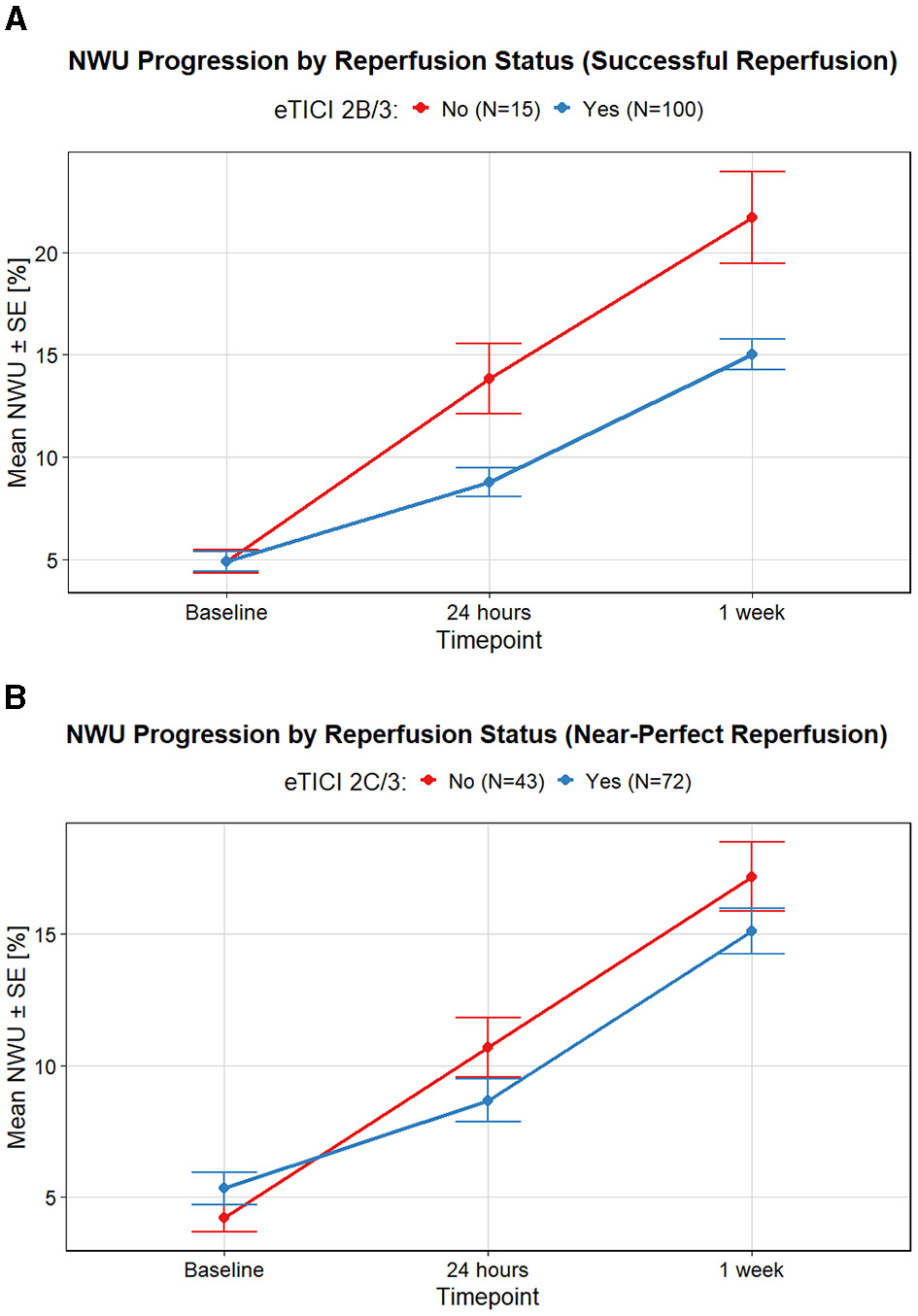 Successful reperfusion (eTICI2B/3) was statistically significantly associated with reduced NWU progression at both timepoints. However, this association between reperfusion status and NWU progression was no longer statically significant at 1 week follow-up if the threshold was set at eTICI2C/3 (Table 2; Figure 3).