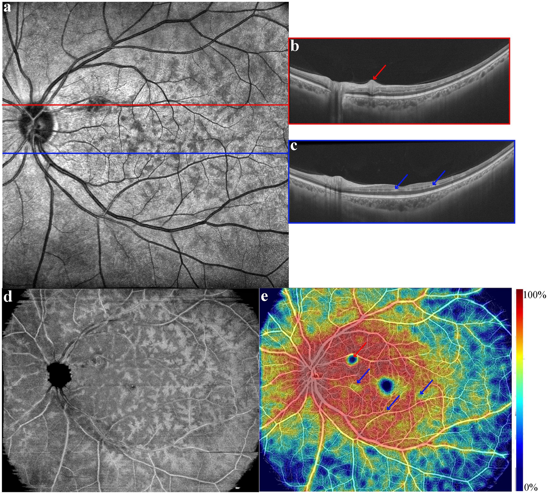 Figure 1. (a) One cotton-wool spot and multiple dark patches around the macula in infrared fundus images of left eye; (b) isolated hyperreflective lesions at retinal nerve fiber layer of red line slice; (c) hyperreflective lesions in the junction of the outer plexus layer and the inner nuclear layer of blue line slice; (d) fern-like hyperreflective lesions around retinal vessels in enface image of the inner nuclear layer; (e) diffuse low-vessel-density areas of retinal vessels on optical coherence tomography angiography; the color scale showed the vessel density (%) of retinal vessels.