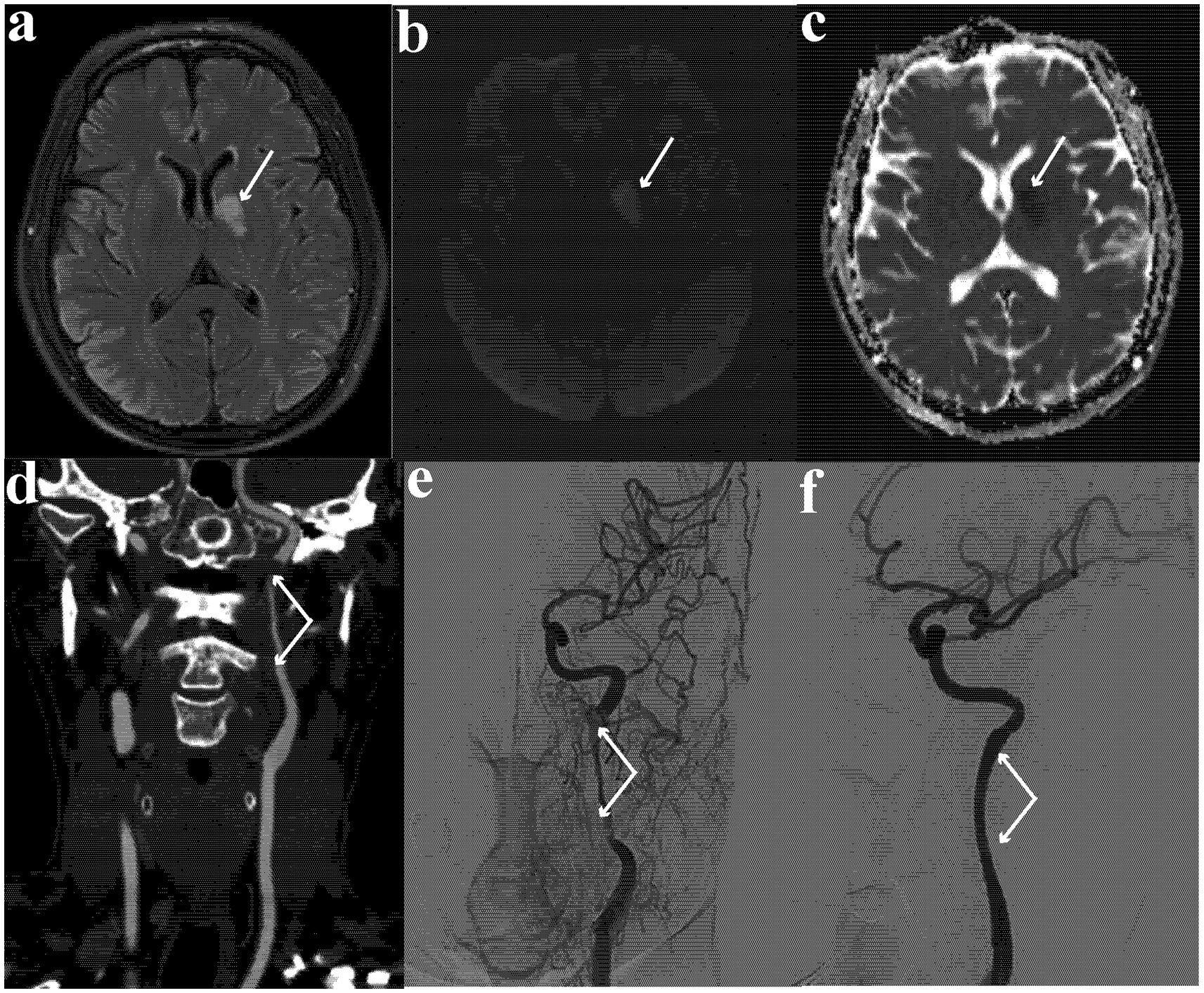 Figure 2. (a) Hyperintense oval lesion at left basal ganglia and inner capsule on fluid-attenuated inversion recovery image; (b) hyperintense oval lesion on diffusion-weighted imaging; (c) reduced apparent diffusion coefficient at the lesion; (d) near occlusion at the upper cervical segment of internal carotid artery and wave-like tunica intima of proximal carotid artery on computed tomography angiogram; (e) carotid dissection with severe stenosis on digital subtraction angiography; (f) repaired internal carotid artery and patent left ICA lumen.