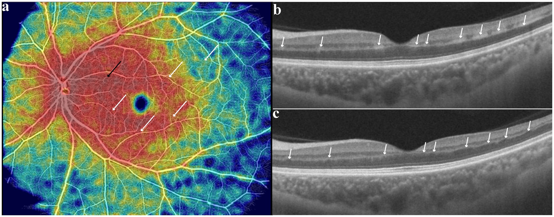 Figure 3. (a) Reperfusion of retinal vessels in previous low-vessel-density areas; (b,c) colocalized focal atrophy of the inner nuclear layer with a compensatory upward expansion of the outer nuclear layer into the outer plexiform layer, at previous hyperreflective foci site.