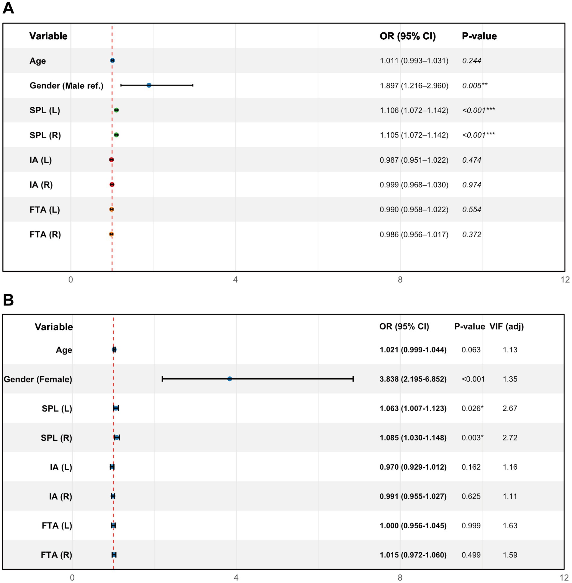 Figure 1. Forest plots of univariable and multivariable logistic regression for factors associated with internal carotid artery (ICA) contact. (A) Univariable logistic regression. (B) Multivariable logistic regression. Points represent odds ratios (ORs); horizontal bars indicate 95% confidence intervals (95% CIs). The vertical dashed line represents OR = 1.0 (no association). SPL-L/SPL-R, left/right styloid process length; IA-L/IA-R, left/right medial inclination angle; FTA-L/FTA-R, left/right anterior tilt angle; VIF (adjusted), variance inflation factor. Significance: p < 0.05 (*), p < 0.01 (**), and p < 0.001 (***).