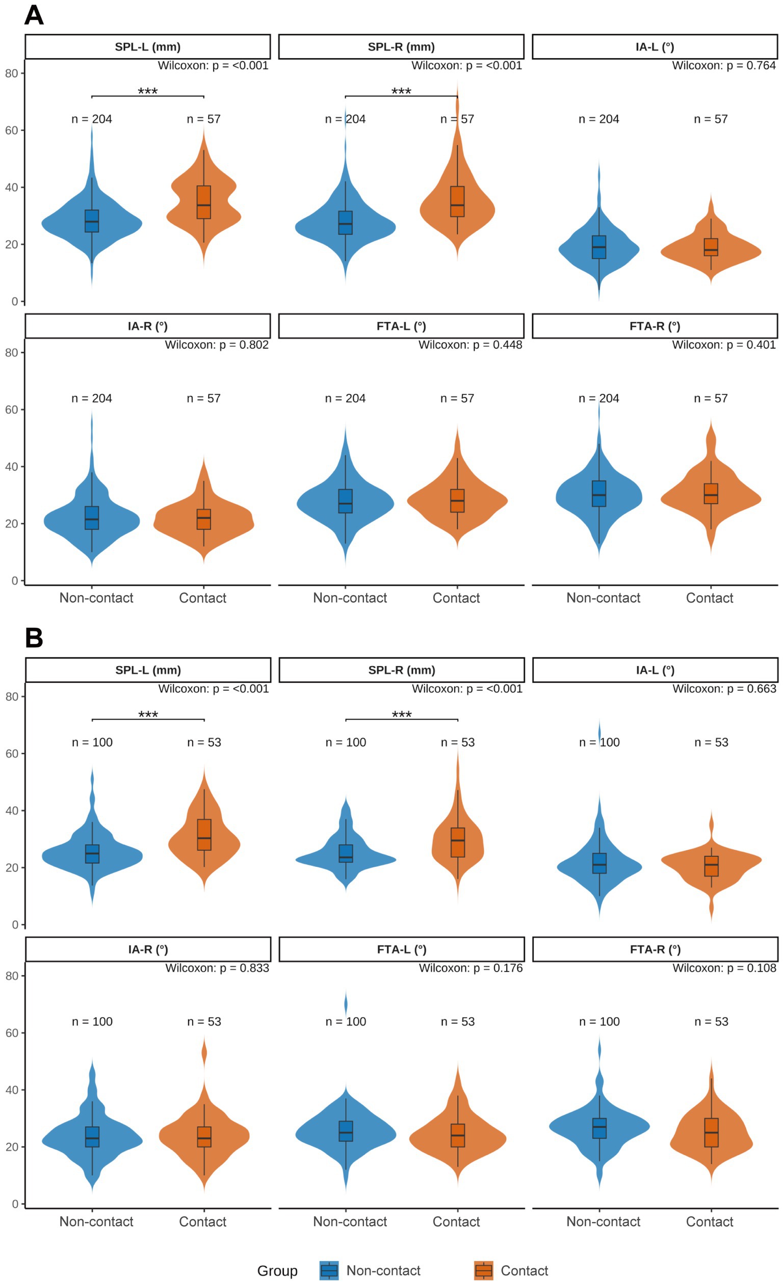 Figure 2. Sex-stratified violin plots comparing styloid process parameters between carotid-contact and non-contact groups. (A) Men; (B) women. SPL-L, left styloid process length; SPL-R, right styloid process length; IA-L/IA-R, left/right medial inclination angle; FTA-L/FTA-R, left/right anterior tilt angle. Blue indicates the non-contact group, orange indicates the contact group. Between-group differences were assessed with the Wilcoxon rank-sum test (Mann–Whitney U). Significance: p < 0.05 (*), p < 0.01 (**), and p < 0.001 (***).