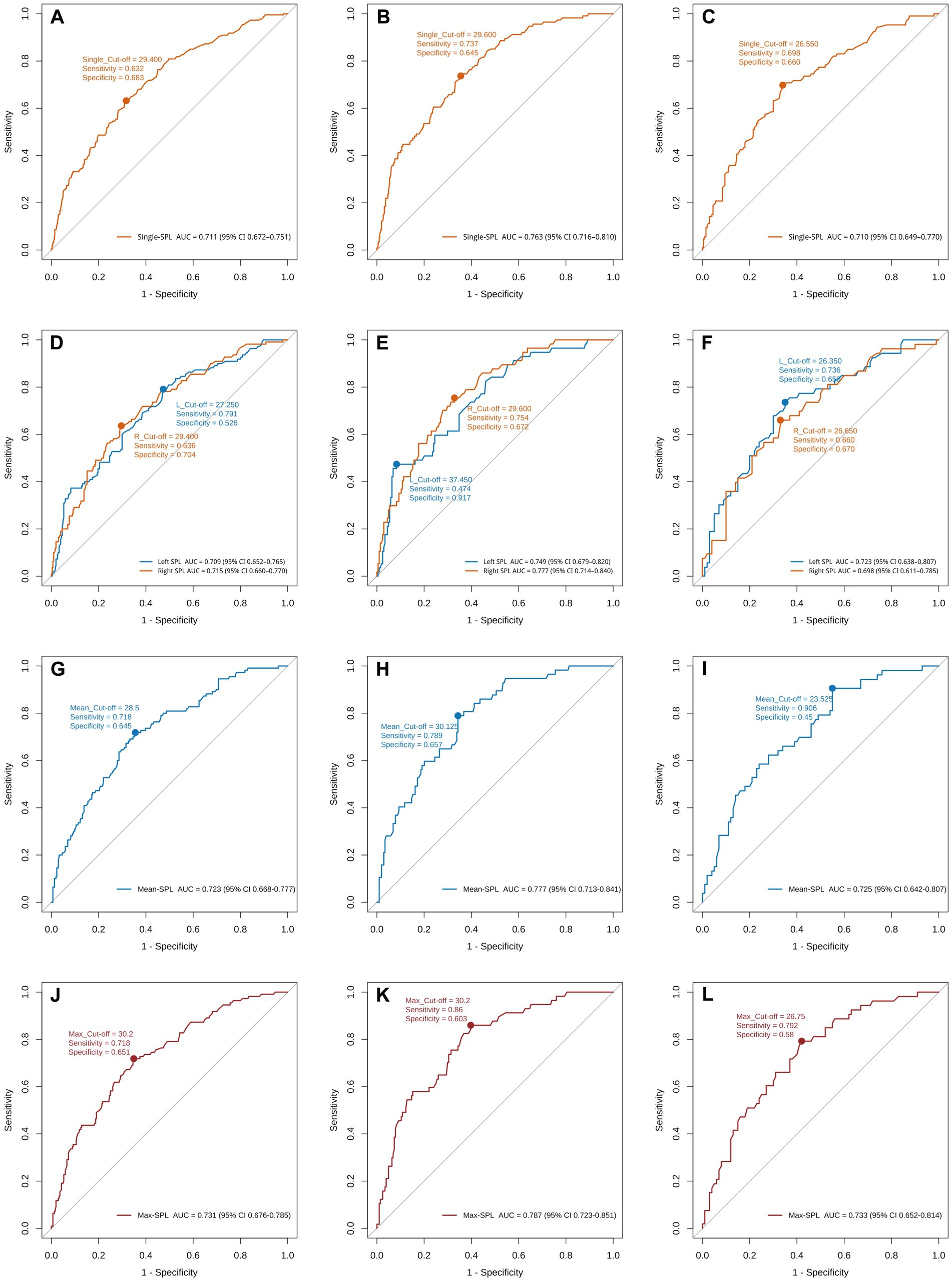 Figure 3. ROC curves of styloid-length metrics for predicting internal carotid artery (ICA) contact in the overall cohort and by sex. (A–C) Bilateral styloid process lengths (SPLs) treated as independent observations (n = 828) in the overall cohort, men, and women, respectively. (D–F) Side-specific (ipsilateral) SPLs with left and right analyzed separately. (G–I) Bilateral mean SPL for each patient, defined as (left SPL + right SPL)/2. (J–L) Bilateral maximum SPL for each patient, defined as max (left SPL, right SPL). For each panel, the area under the curve (AUC), the optimal cut-off (Youden index), sensitivity, and specificity are displayed on the plot. SPL, styloid process length.