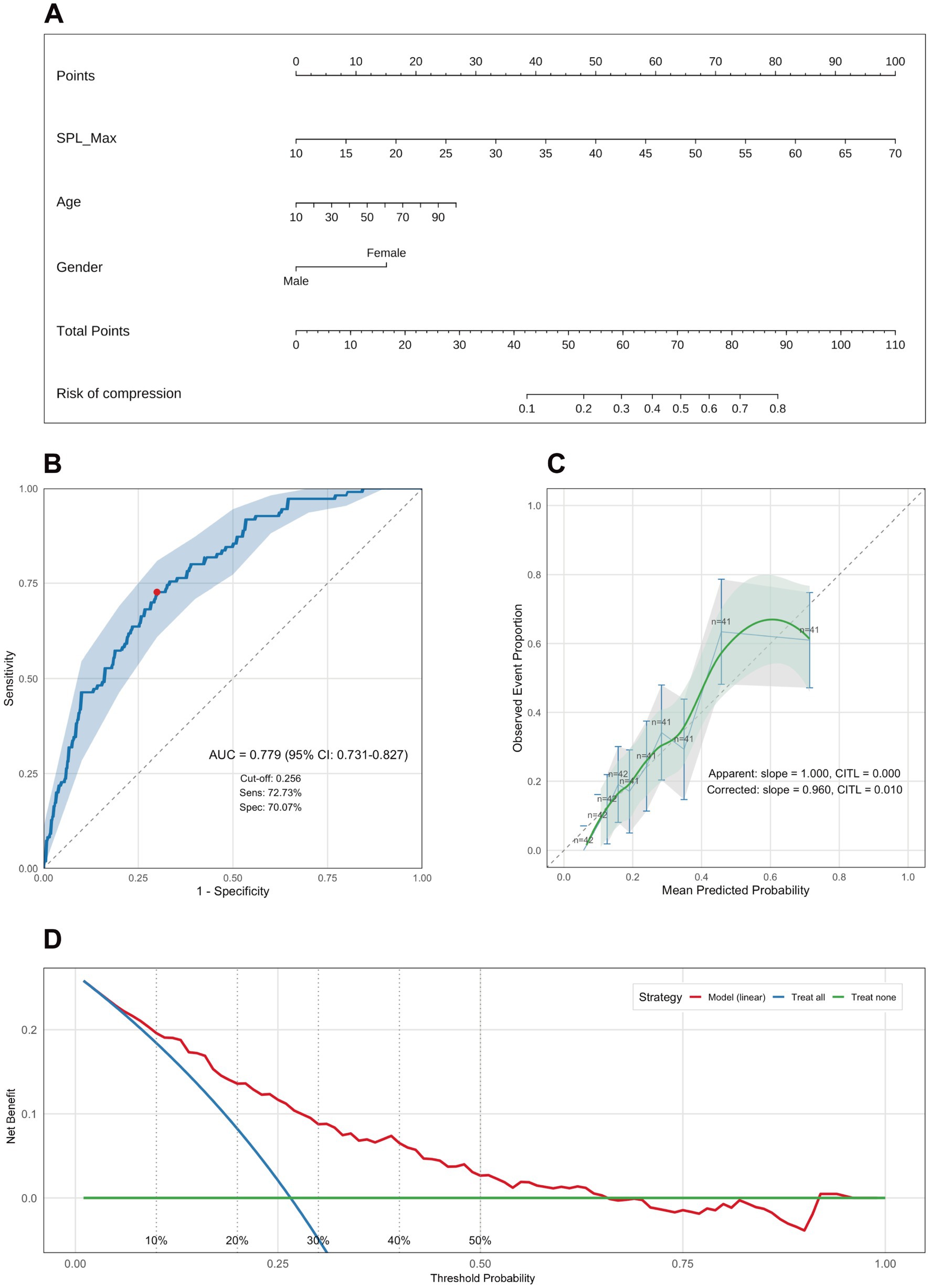 Figure 4. Nomogram for predicting internal carotid artery (ICA) contact and model performance evaluation. (A) Nomogram constructed using bilateral maximum styloid process length (SPL-Max), age, and sex (plotted as Gender). The total score for a given patient maps to the predicted probability of internal carotid artery (ICA) contact. (B) Receiver operating characteristic (ROC) curve demonstrating model discrimination: AUC = 0.779 (95% CI: 0.731–0.827); optimal cut-off by Youden index = 0.296; sensitivity = 72.73%, specificity = 70.07%. (C) Calibration plot comparing predicted probabilities with observed rates. Apparent calibration: slope = 1.000, calibration-in-the-large (CITL) = 0.000. Bootstrap-corrected: slope = 0.960, CITL = 0.010. (D) Decision curve analysis (DCA) shows that the model achieves a positive net benefit across the 1–65% threshold range, supporting its potential clinical utility. SPL-Max, bilateral maximum styloid process length; AUC, area under the curve; CI, confidence interval; CITL, calibration-in-the-large; DCA, decision curve analysis.