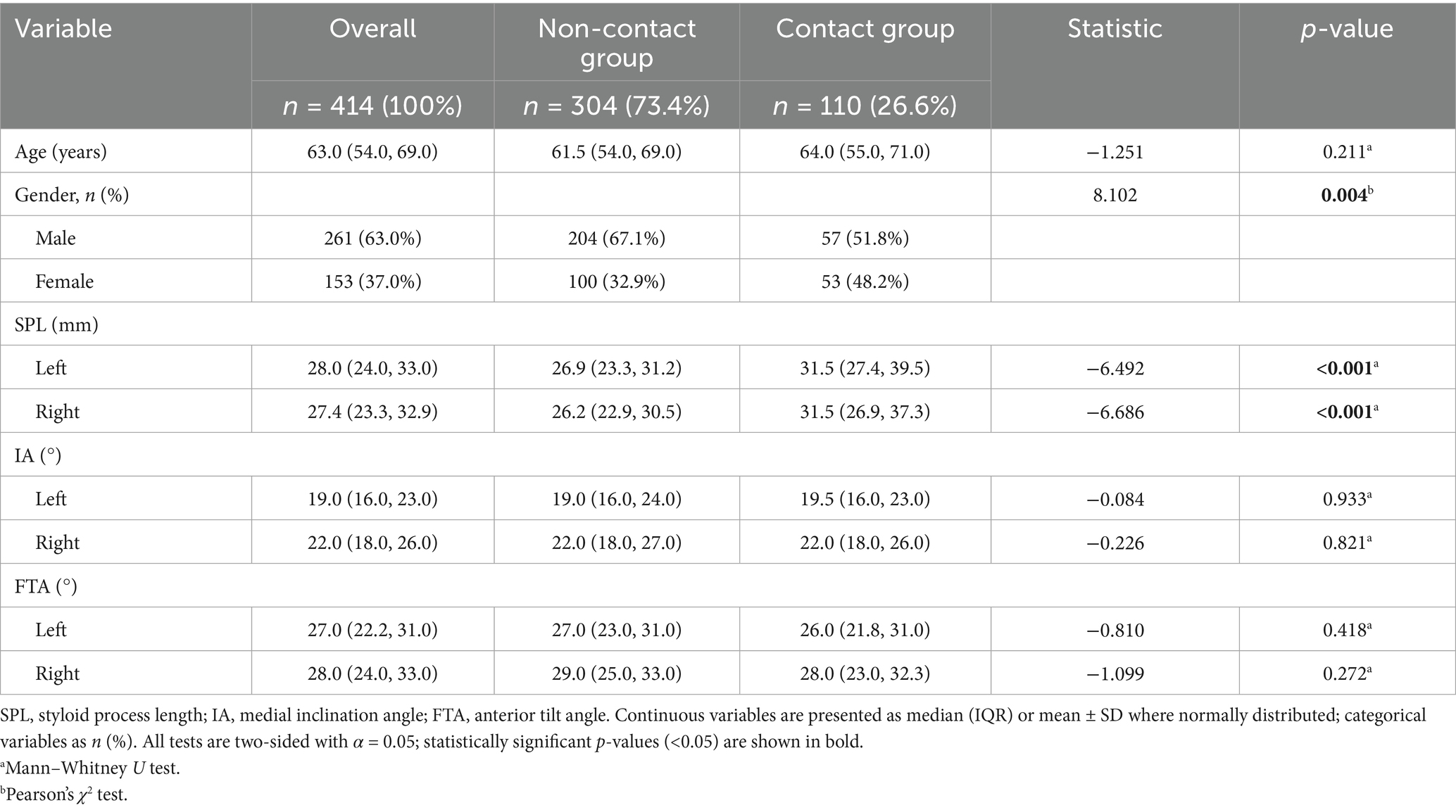 A total of 414 patients were included. Based on whether the styloid process was in direct contact with the ipsilateral internal carotid artery (ICA), participants were classified into a contact group (n = 110, 26.6%) and a non-contact group (n = 304, 73.4%). Baseline characteristics and styloid parameters are summarized in Table 1. The median age was 64.0 years [interquartile range (IQR), 55.0–71.0] in the contact group and 61.5 years (IQR, 54.0–69.0) in the non-contact group, with no significant difference in age distribution (Z = −1.251, p = 0.211). Sex distribution differed significantly (χ2 = 8.102, p = 0.004): the proportion of men was lower in the contact group than in the non-contact group (51.8% vs. 67.1%), suggesting that women were more likely to exhibit styloid–ICA contact as a potential structural susceptibility factor.