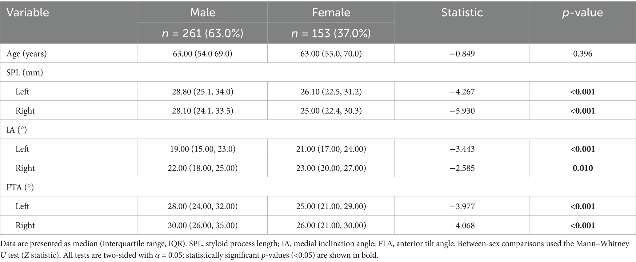Given that sex emerged as an independent predictor in the overall analysis, we conducted sex-stratified comparisons of structural parameters. Among the 414 patients, 261 were men (63.0%) and 153 were women (37.0%). There was no between-sex difference in age distribution (median 63.0 vs. 63.0 years; Z = −0.849, p = 0.396). Styloid-related parameters differed significantly by sex (Table 2): men had greater bilateral styloid process lengths (SPLs) (both p < 0.001) and larger anterior tilt angles (FTAs) (both p < 0.001), whereas women had larger medial inclination angles (IAs) (left IA: 21.0° vs. 19.0°, Z = −3.443, p < 0.001; right IA: 23.0° vs. 22.0°, Z = −2.585, p = 0.010). These findings suggest that, although men exhibit longer styloids and greater anterior tilt, women—potentially due to a relatively narrower cranial base–ICA corridor—may be more prone to styloid–ICA contact under comparable length conditions, a sex-specific structural susceptibility that may modulate the pathogenesis of ES–CA.