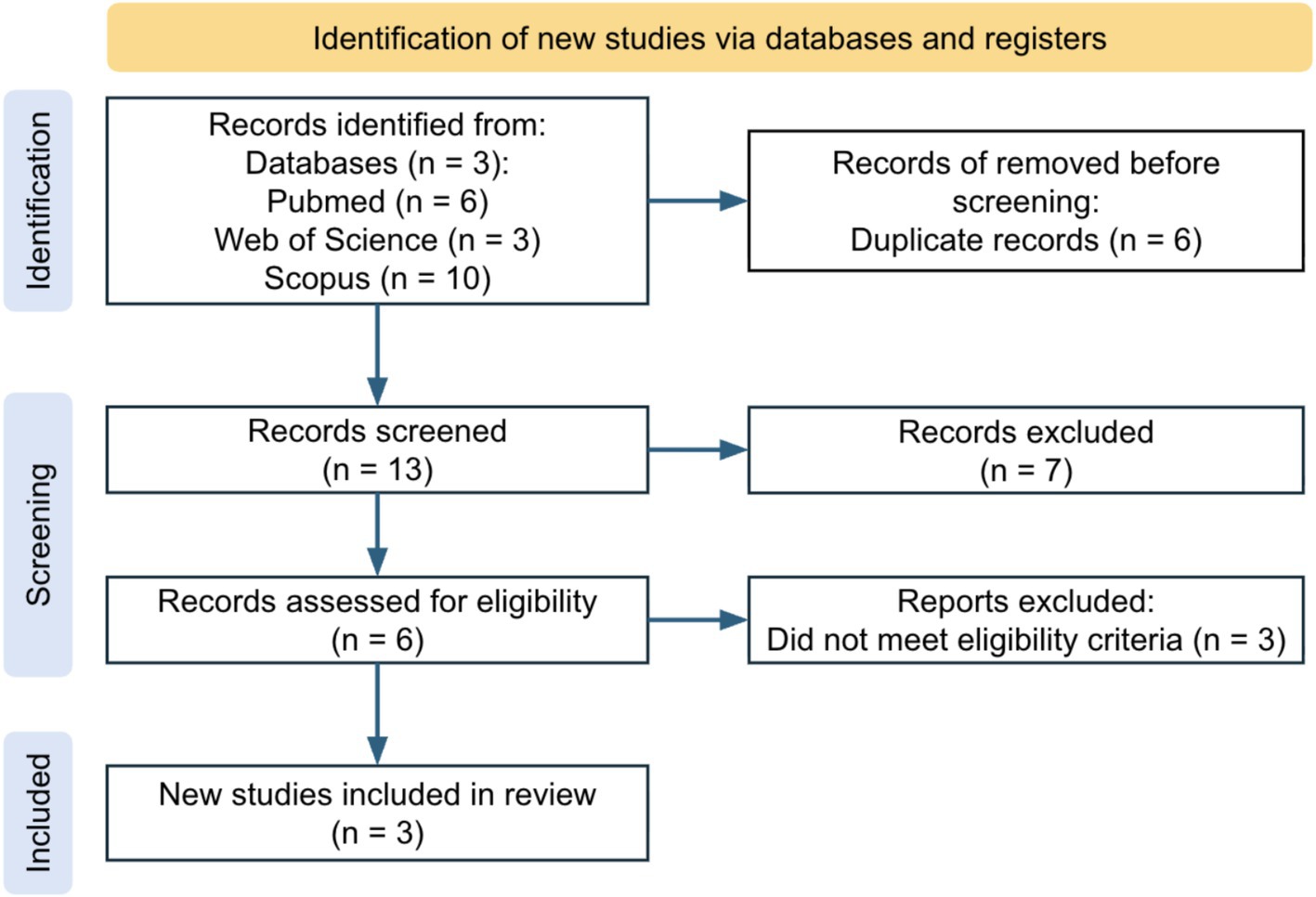 Figure 1. PRISMA flowchart illustrating the study selection process. A total of 19 records were identified through database searching (PubMed = 6, Web of Science = 3, Scopus = 10). After removing 6 duplicates, 13 records were screened, of which 7 were excluded. Six full-text articles were assessed for eligibility, and 3 met the inclusion criteria and were included in the review.
