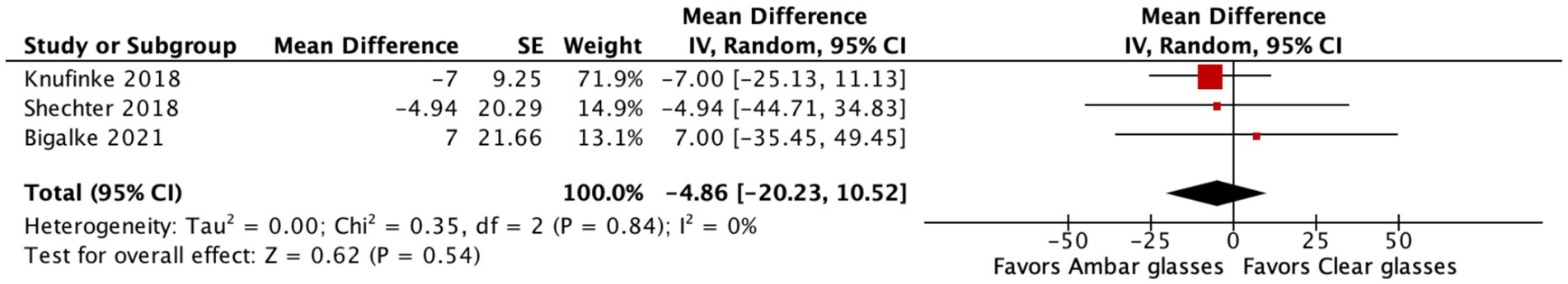 All three studies provided data for SOL. The pooled estimate showed a mean difference (MD) of −4.86 min [95% confidence interval (CI): −20.23 to 10.52], favoring BBGs over clear lenses (Figure 2). However, this difference was not statistically significant (p = 0.54). Heterogeneity across studies was low (I2 = 0%), indicating consistency in direction and magnitude of effects.