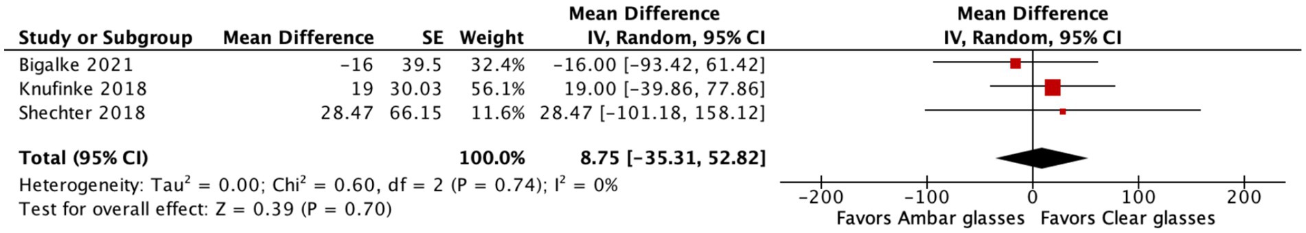 Figure 3. Forest plot of BBGs versus clear lenses on total sleep time. The pooled MD was +8.75 min (95% CI: −35.31 to 52.82; p = 0.70), indicating a non-significant increase with BBGs. Heterogeneity was low (I2 = 0%).