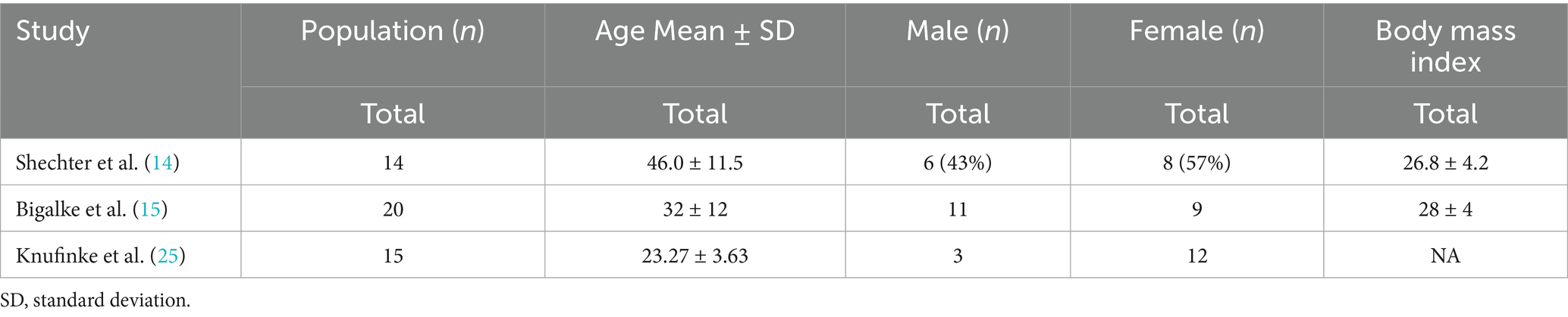The total sample comprised 49 participants. Shechter et al. (14) studied 14 adults (57% female; mean age = 46.6 ± 11.5 years; BMI = 26.8 ± 4.2 kg/m2) who met clinical criteria for chronic insomnia symptoms, verified through the Insomnia Symptoms Questionnaire (ISQ). Knufinke et al. (25) recruited 15 recreational athletes (80% female; mean age = 23.3 ± 3.6 years) with no major sleep complaints. Bigalke et al. (15) included 20 healthy adults (45% female; mean age = 32 ± 12 years; BMI = 28 ± 4 kg/m2) with no diagnosed sleep disorders. Further demographic details are provided in Table 1.