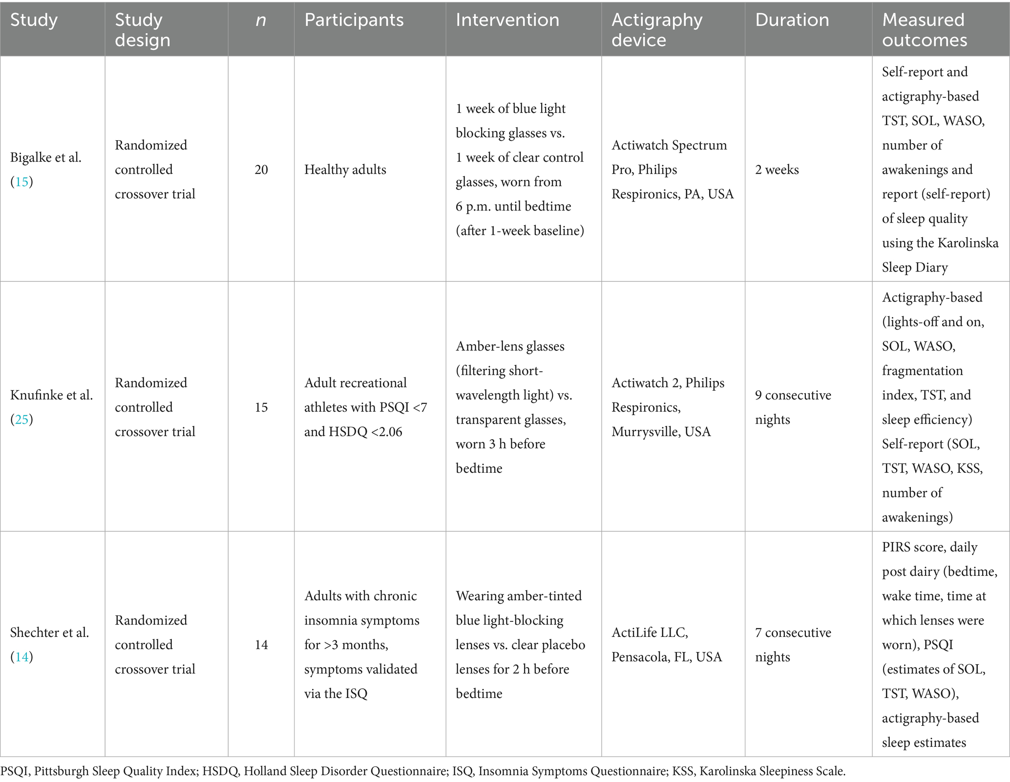 Each study compared amber-tinted BLB lenses against visually indistinguishable clear-lens controls. Intervention protocols varied slightly: Shechter et al. (14) instructed participants to wear lenses for 2 h before bedtime over 7 consecutive nights; Knufinke et al. (25) applied a 3-h pre-sleep exposure over 9 nights; and Bigalke et al. (15) extended exposure from 6 p.m. until bedtime for 7 nights, following a 1-week baseline. Washout periods also differed: Shechter et al. (14) used a 4-week washout, Knufinke et al. (25) applied 4 days, and Bigalke et al. (15) incorporated a 1-week baseline period instead of a formal washout. Intervention protocols and design features are summarized in Table 2.