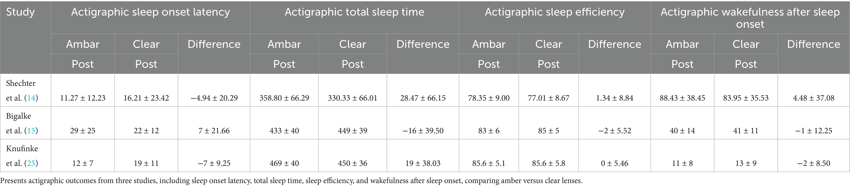 The extracted means and standard deviations for actigraphy-based sleep outcomes from the included studies are summarized in Table 3. These data were used to calculate effect sizes for each sleep parameter (TST, SOL, SE, WASO) in the meta-analysis. Differences refer to the change from the amber lens condition relative to the clear control condition.