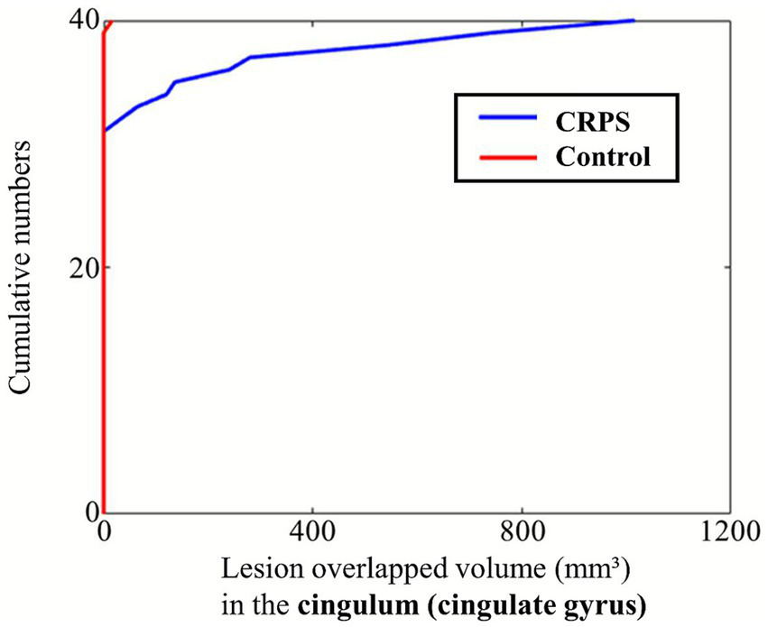 ECDF plot of lesion overlap volume with the cingulum (cingulate gyrus) in the CRPS and control groups. The ECDF represents the cumulative probability that the lesion overlap volume is less than or equal to a given value. A leftward shift of the curve indicates smaller overlap volumes, whereas a rightward shift reflects larger overlaps. The plot demonstrates group-wise differences in lesion involvement of the cingulum. CRPS, complex regional pain syndrome; ECDF, empirical cumulative distribution function.